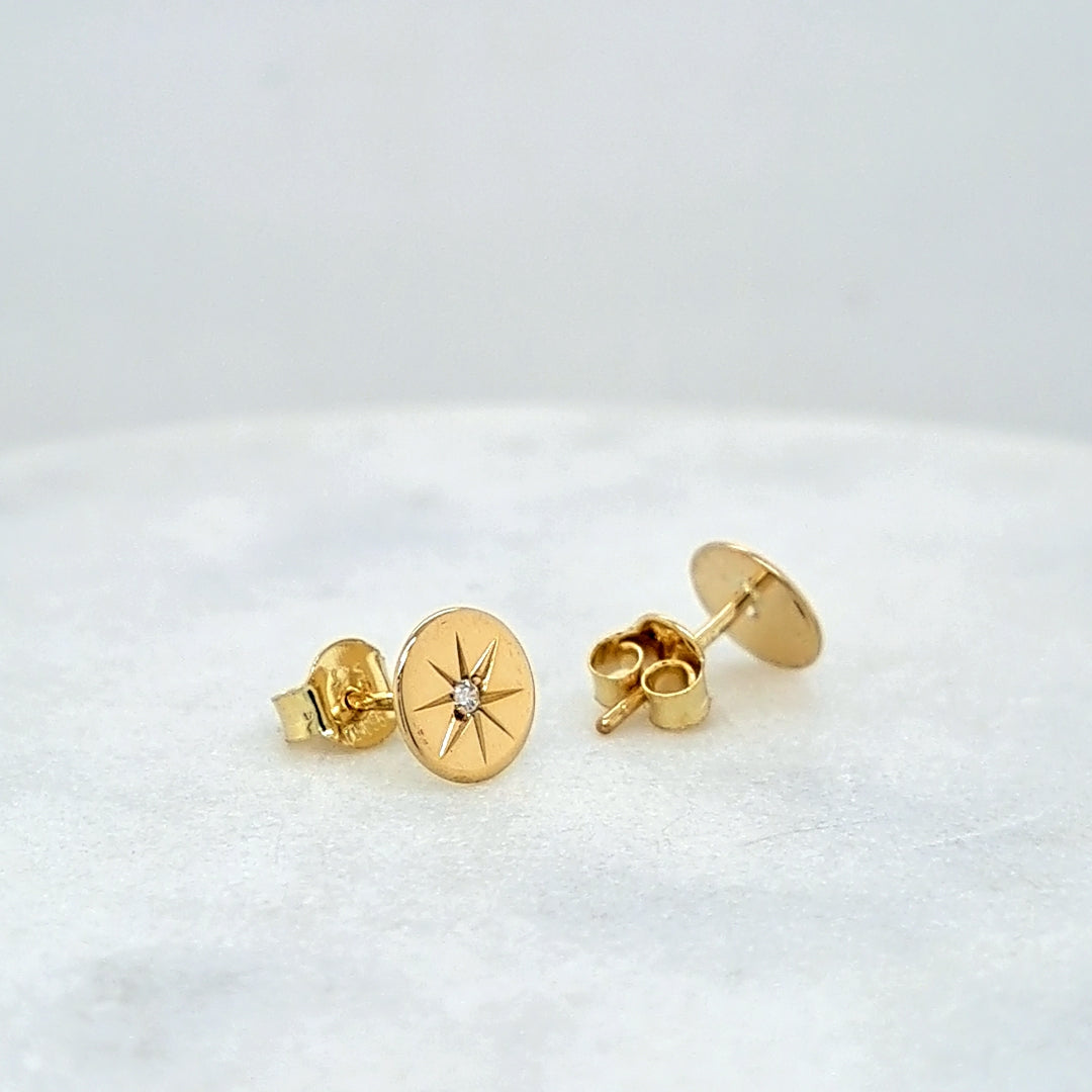 9ct gold flat disc studs with an inlaid star design and set with 2 zirconia stones. The perfect stud! Also has a matching 9ct gold pendant.