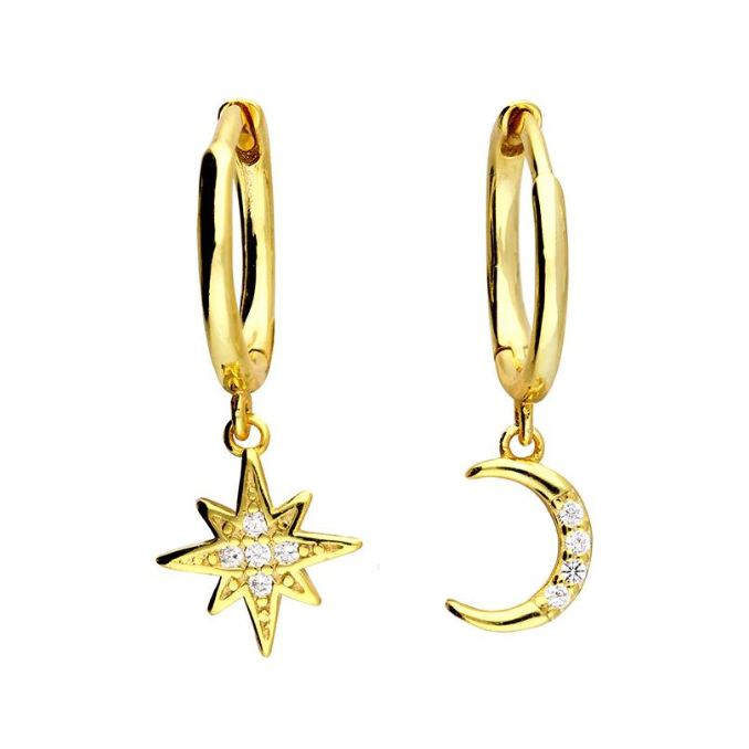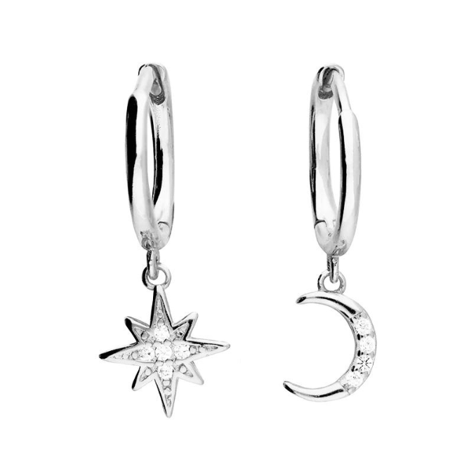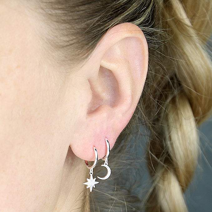 Asymmetric star and moon huggie hoops, available in gold plated or sterling silver with beautiful cubic zirconia.