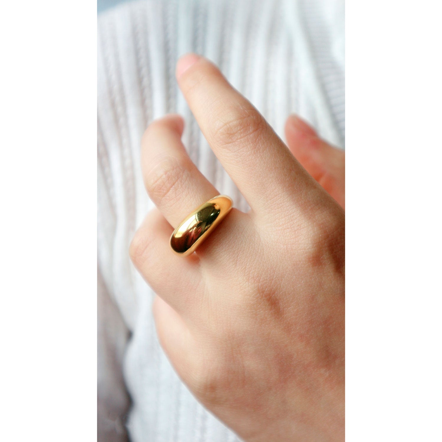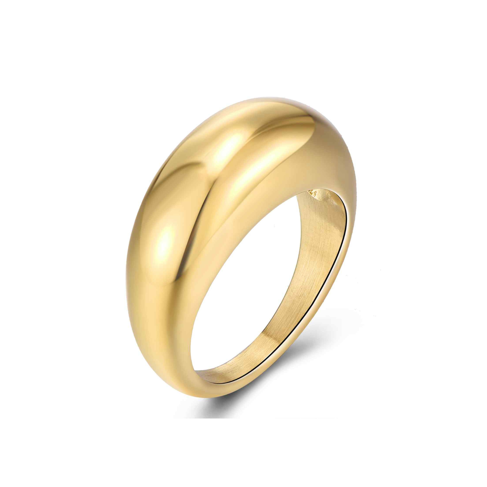 The Bella ring has a chunky dome shape that can be worn stacked with our other gold rings on its own. It is 18ct gold plated on stainless steel making it sturdy enough for everyday wear.