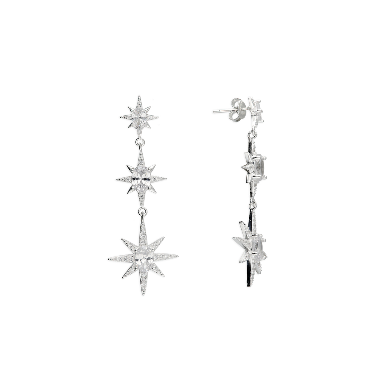 These silver cubic zirconia star earrings showcase a celestial-inspired design, featuring a stunning cascade of three intricately crafted star motifs.