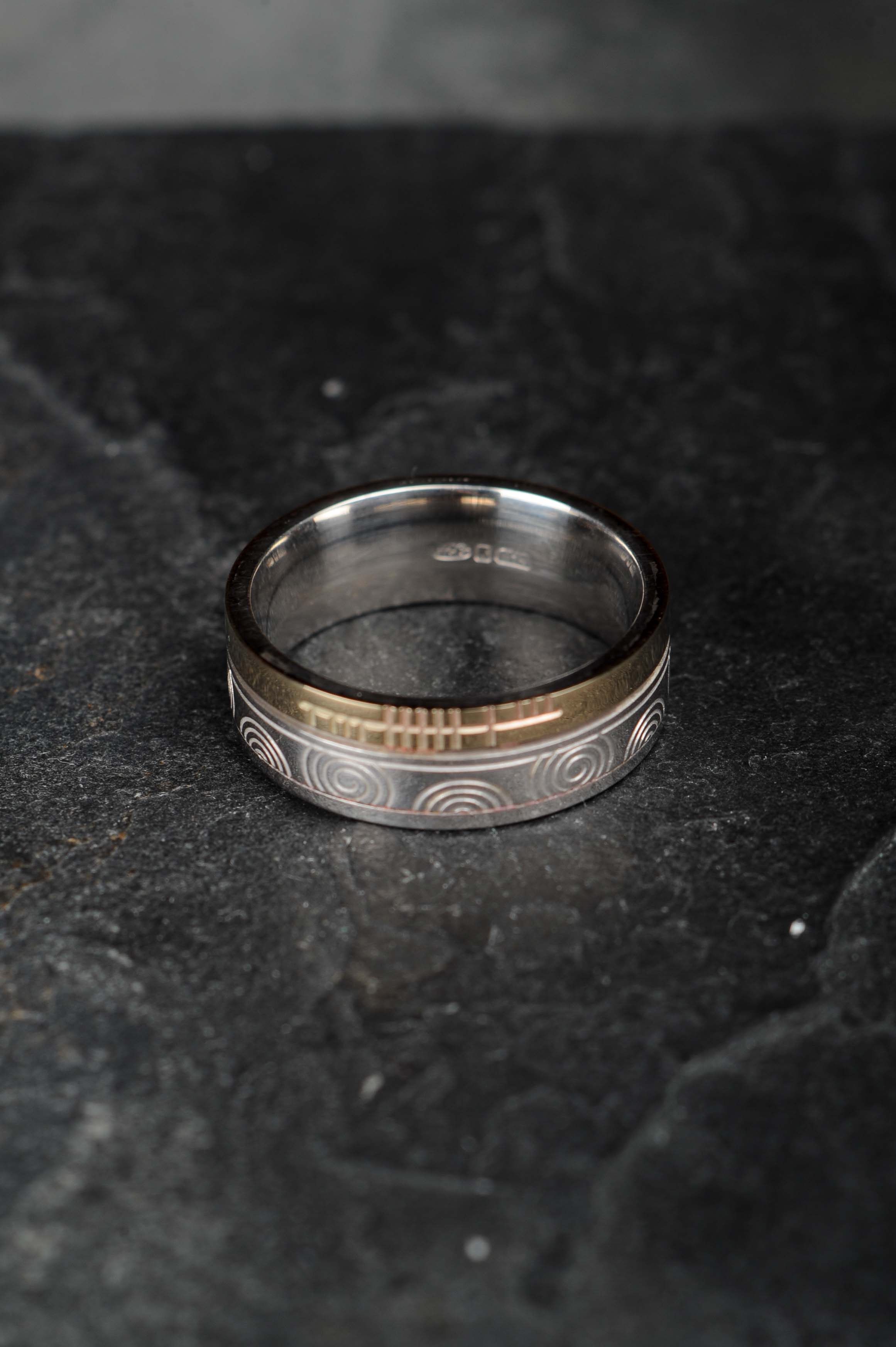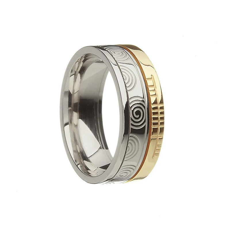 Sterling silver and 10ct unisex band inscribed with the word FAITH in Ogham script and features beautifully etched spirals found on the entrance stone at Newgrange.