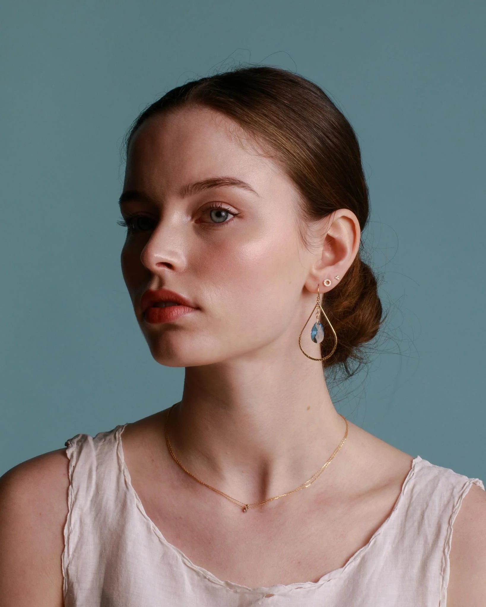 Shimmer and sparkle in this gold-filled pair of teardrop earrings featuring exquisitely-coloured aquamarine crystals. Mix and match these earrings with the other aquamarine pieces from MoMuse.