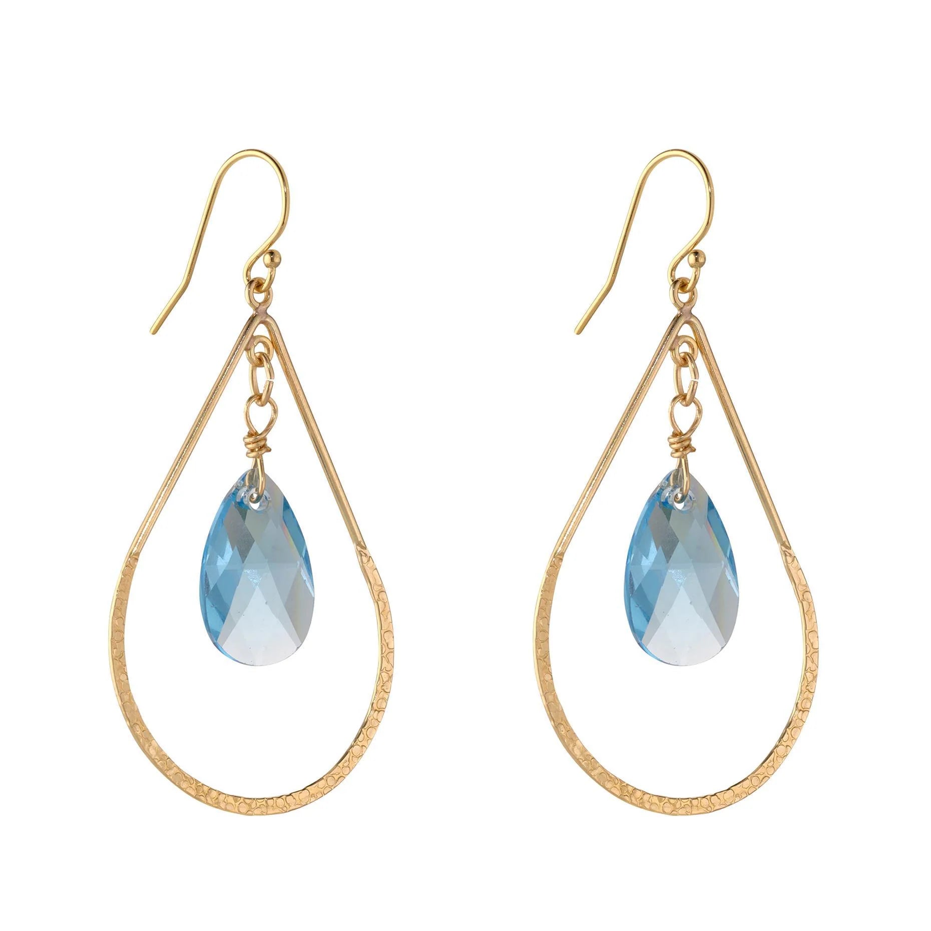 Gold Filled 16mm Aquamarine Crystal Hammered Teardrop Earrings