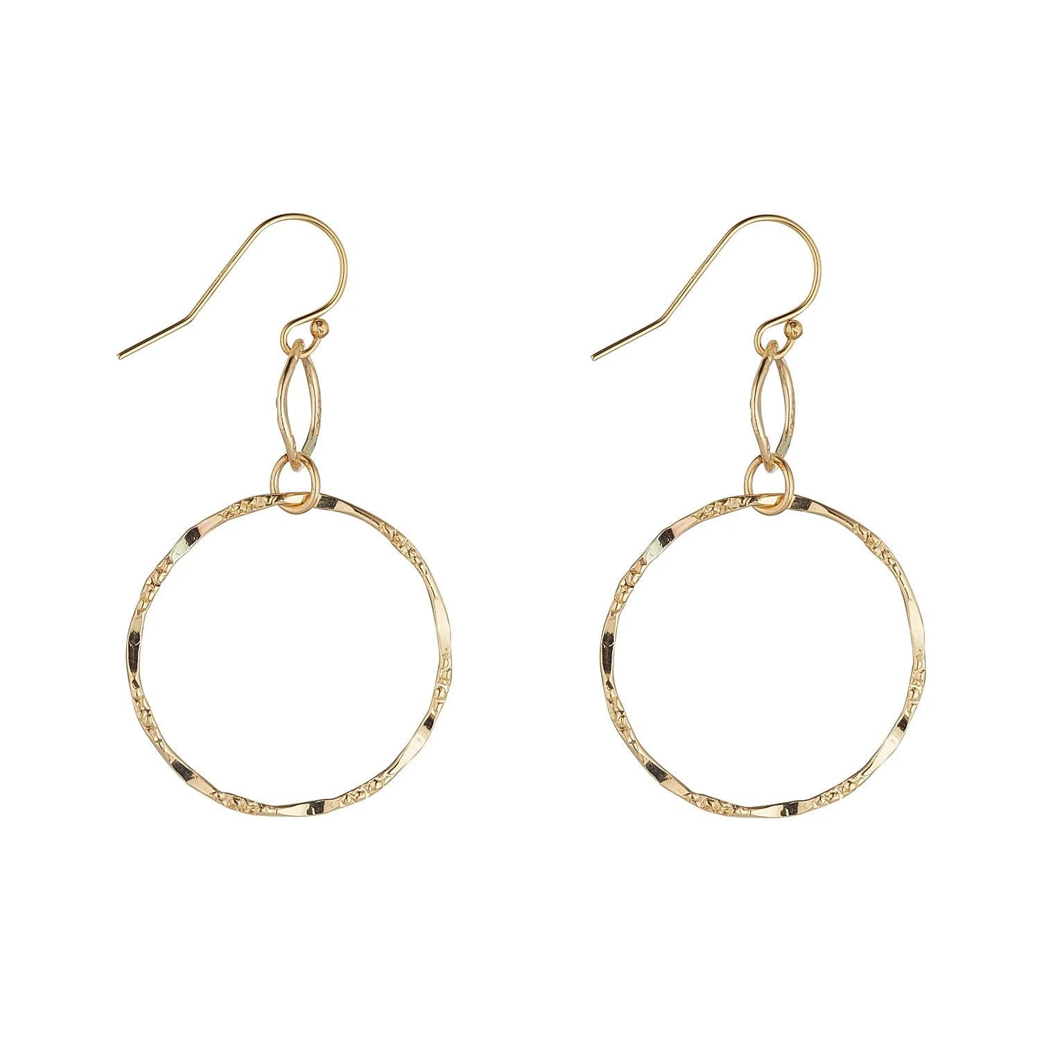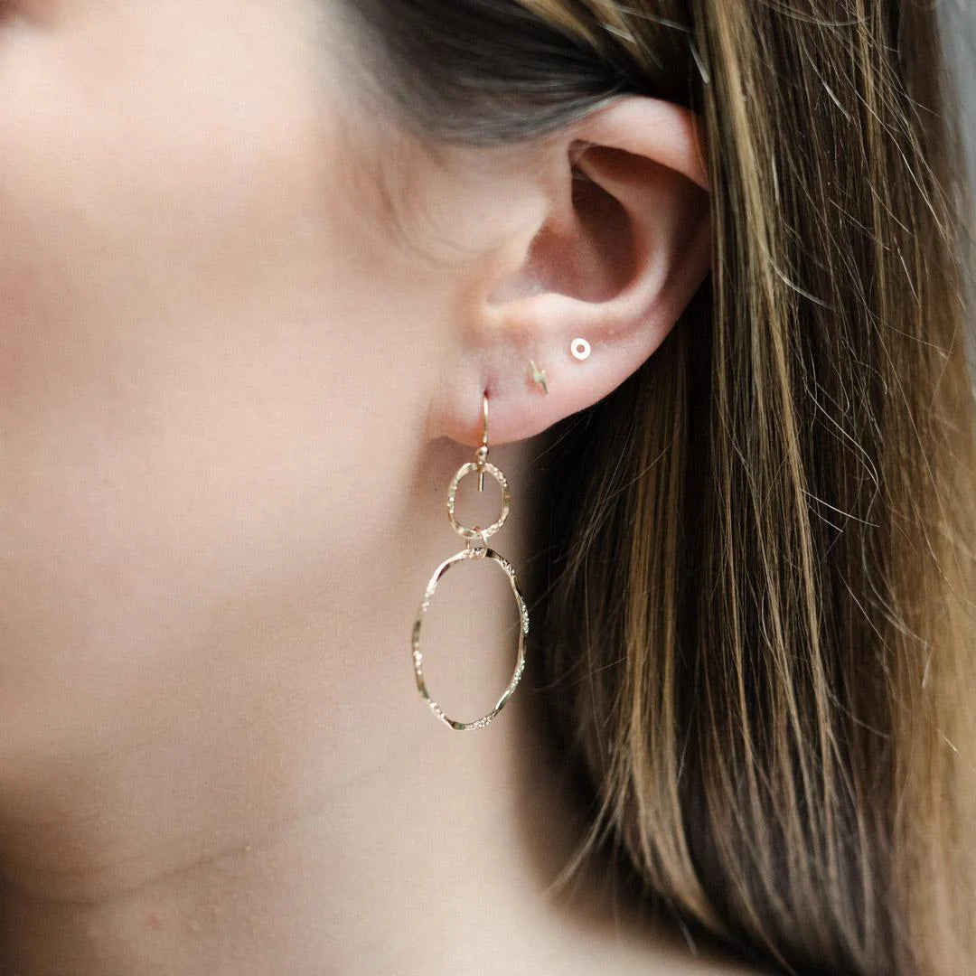 A tried and tested MoMuse favourite, these versatile 14ct gold filled earrings never let us down. Featuring two gold circles in different sizes, they hang delicately from the ear and catch the light on the texture of the finish.