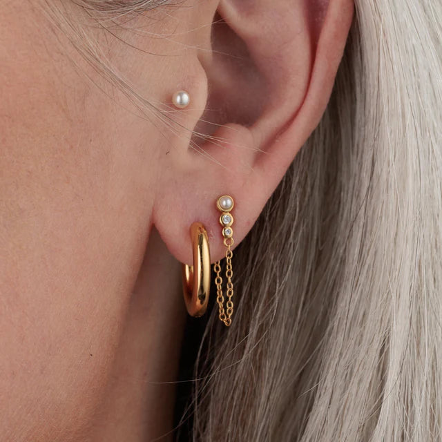 Featuring a luminous pearl stud paired with two sparkling cubic zirconia stones, these earrings are all about the details. The delicate chain connector adds effortless movement. Whether you're stacking them up or letting them steal the show solo, these pearl chain studs bring a fresh, modern twist to classic pearl earring.