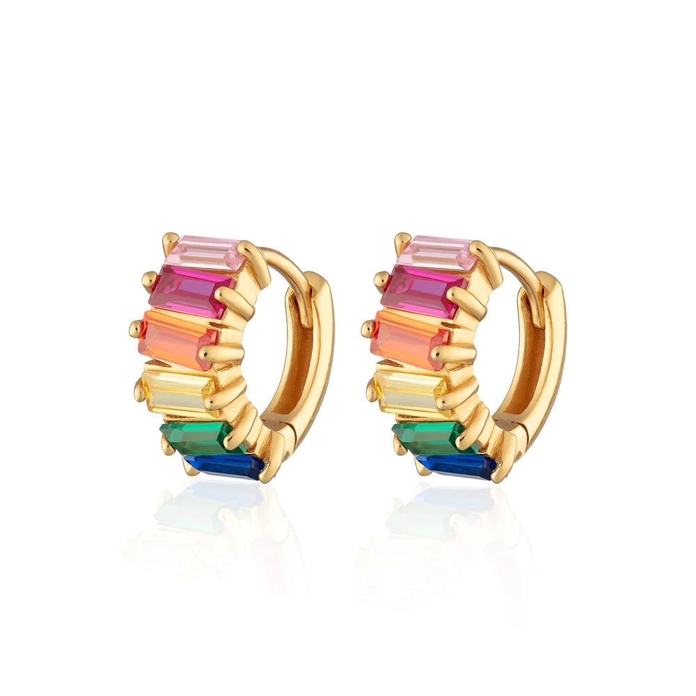 Crafted from sterling silver, these huggies are set with 6 inlaid baguette cut cubic zirconia stones, each one adorning a different colour of the rainbow. Featuring a hinged click to close clasp, these rainbow huggies are perfect to wear on their own or layered as part of an ear stack to add pops of colour.