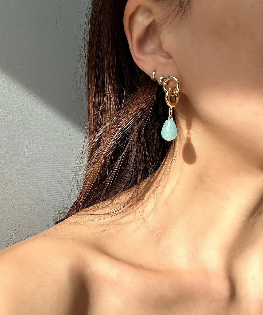 These stunning teardrop shaped earrings are made with polished sky blue amazonite and 16ct gold plated brass eternity shape inspired ear studs. Eternity is a perfect statement earring that goes with everything. A teardrop jade is set on stud fitting with wide backing for comfort and security.