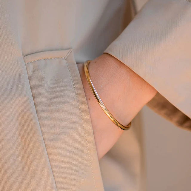 A classic and simple bangle. This narrow round cut bangle can be worn with anything. Wear on its own or stacked with other bangles, its the ultimate versatile accessory! A heavier version is also available in the same range.