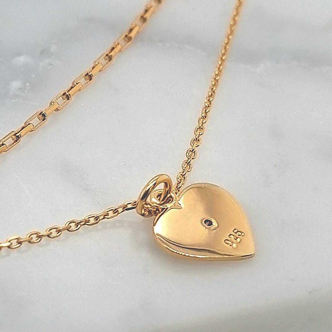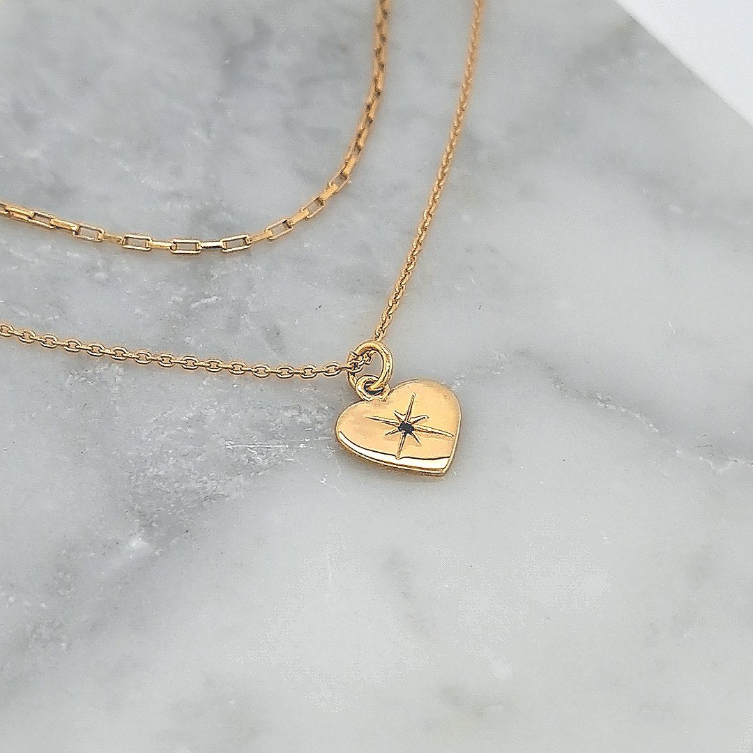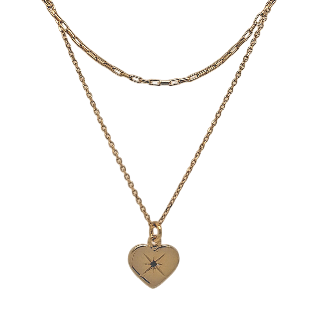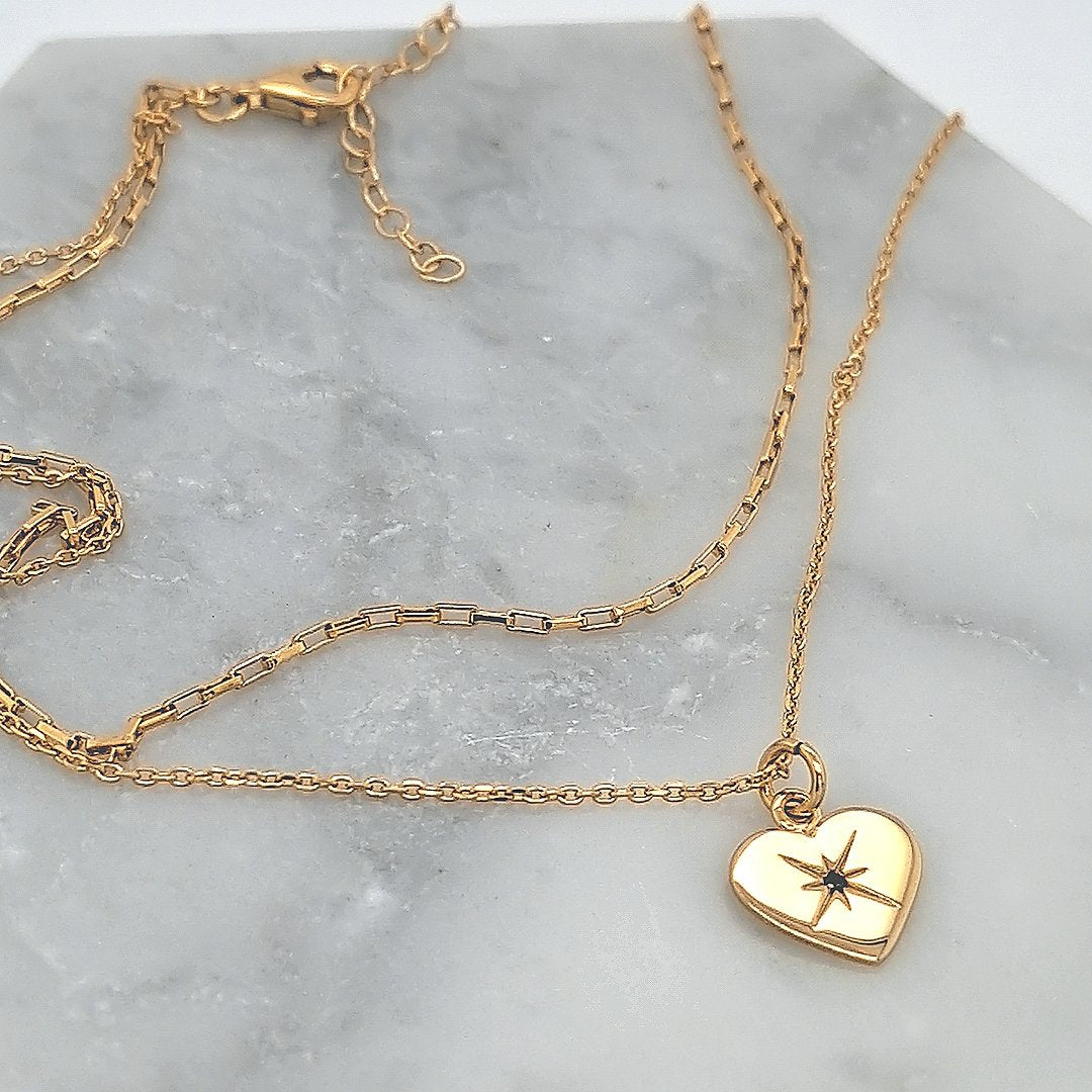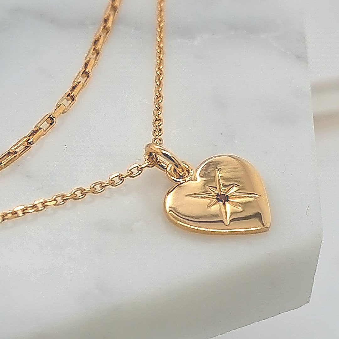 Sweet yellow double chain with a gorgeous heart pendant. The heart is engraved with a star and set with a ruby-red colour zirconia stone. Get the layered look in one necklace!