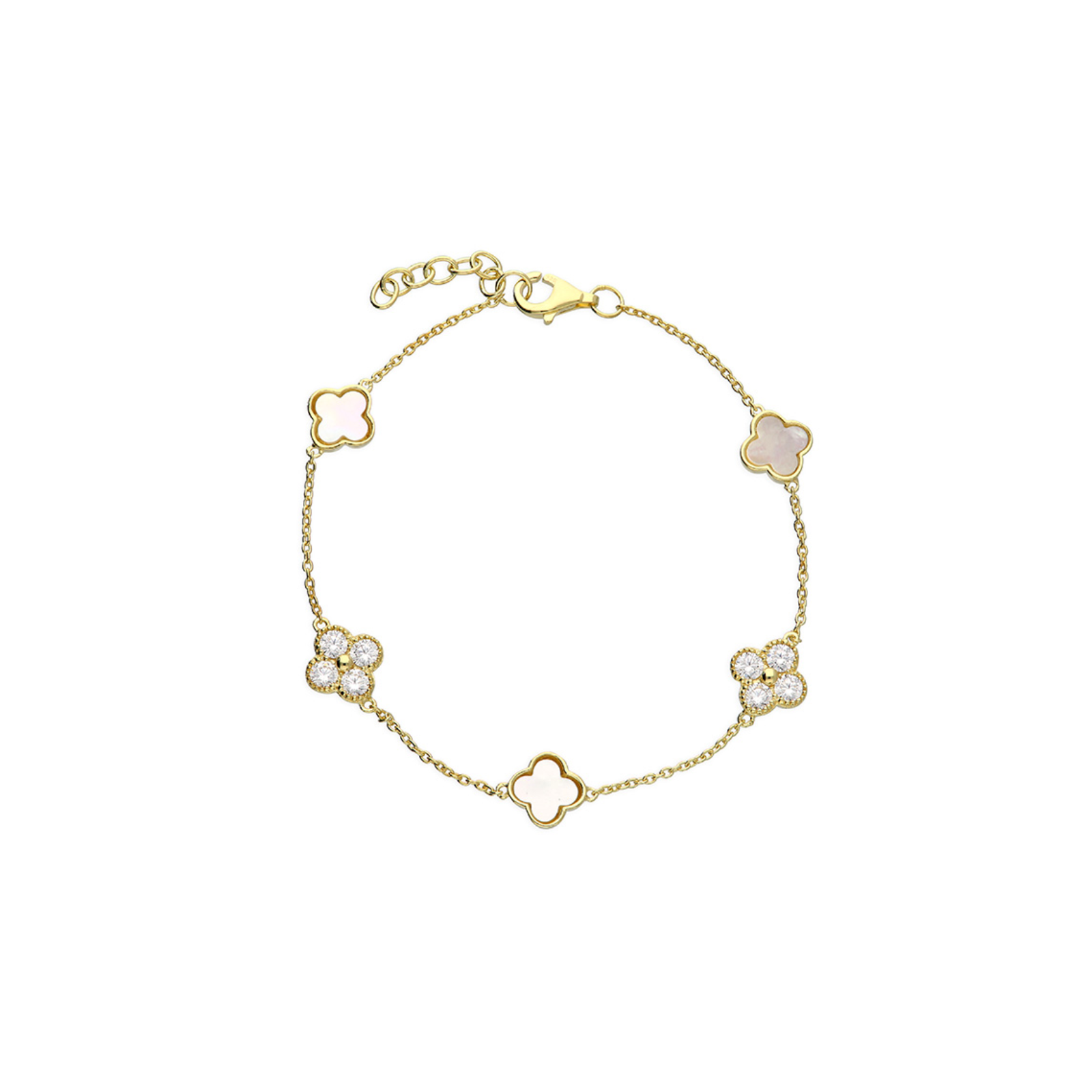Elegant and eye-catching, this sterling silver bracelet is finished in warm yellow gold-plating and features a series of alternating clover charms. Each charm is set with either luminous mother of pearl or sparkling cubic zirconia, creating a soft rhythm of shine and iridescence.