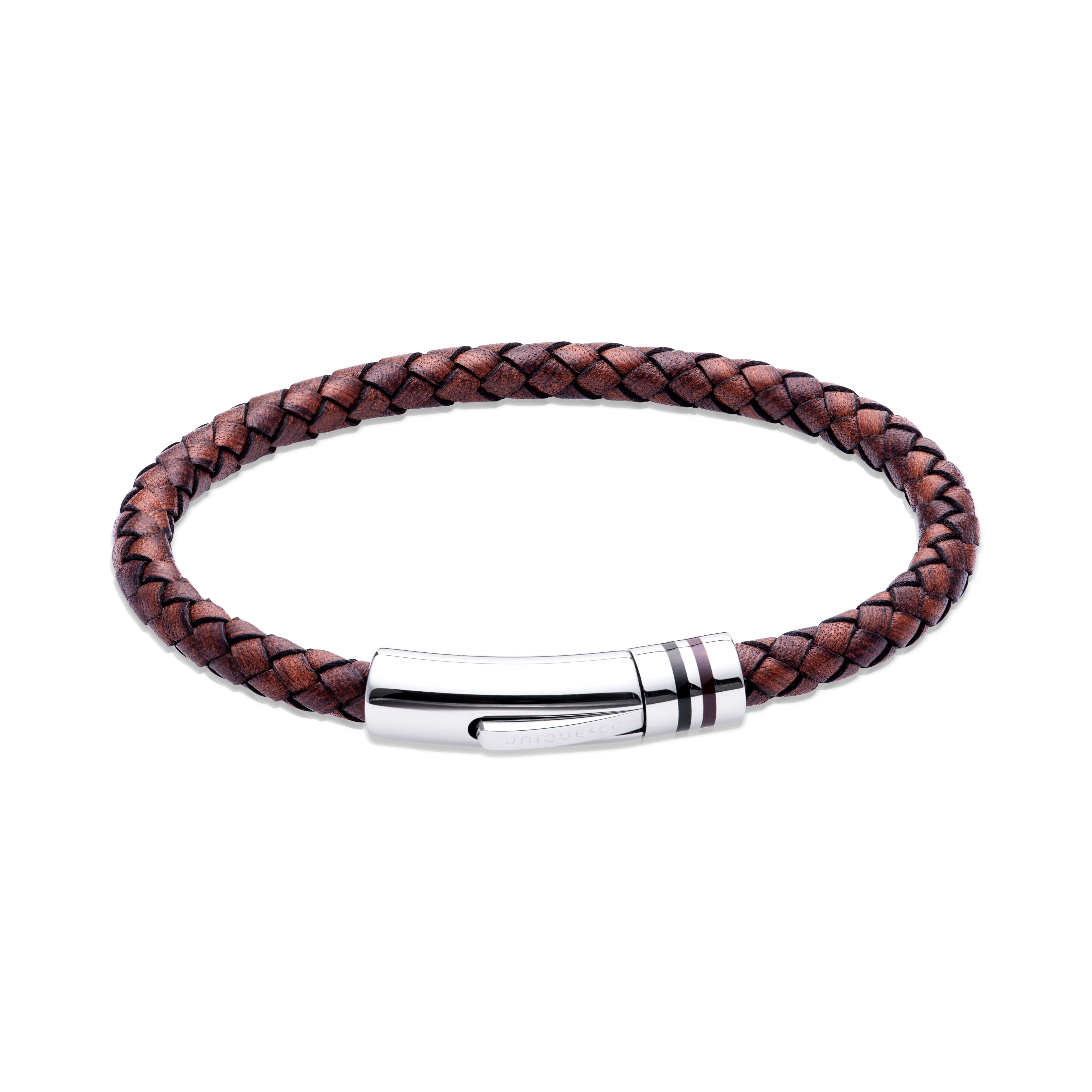 Men's braided brown leather bracelet. Featuring a secure polished stainless steel clasp with brown/black IP plating detail.