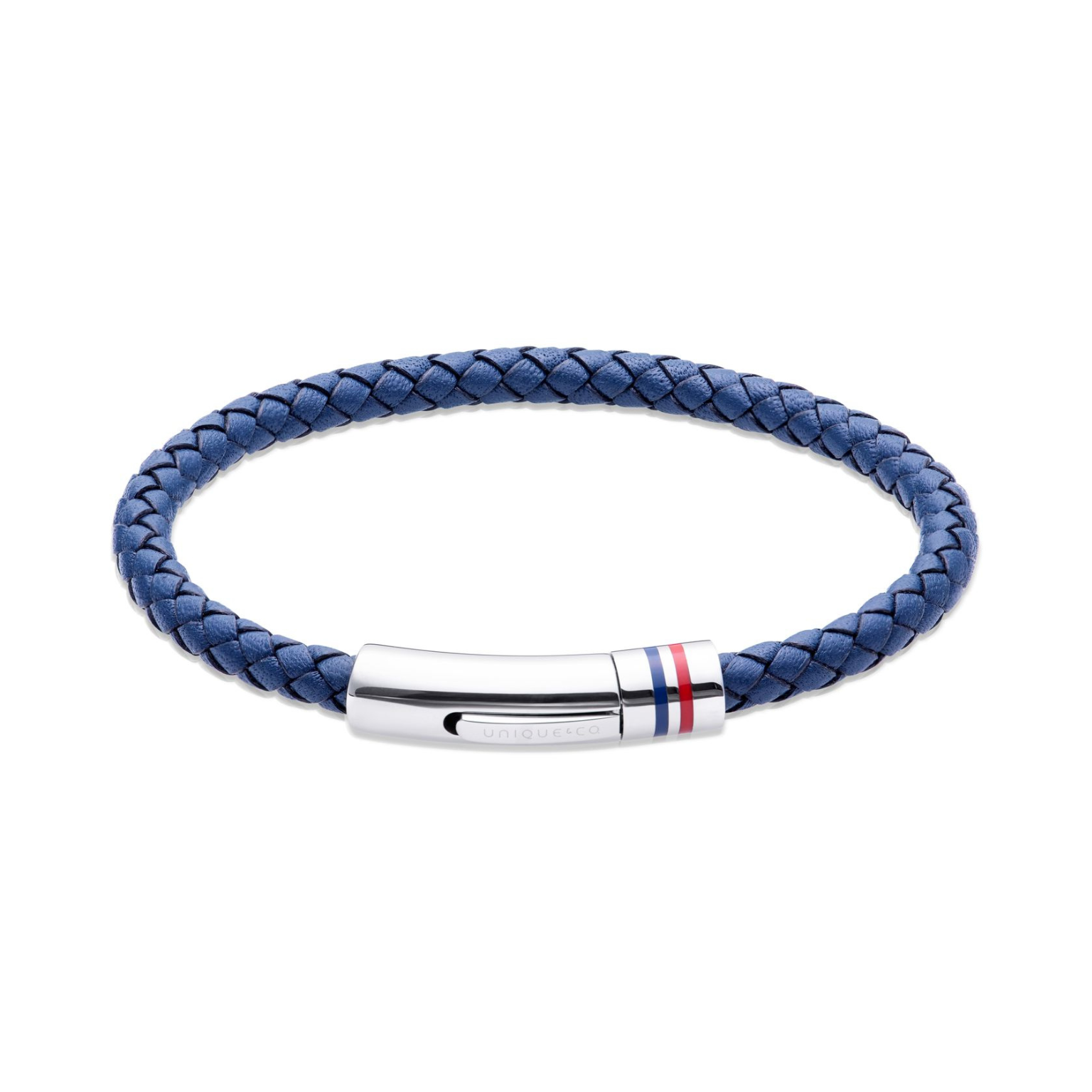 Men's braided navy leather bracelet. Featuring a secure polished stainless steel clasp with blue/red IP plating detail.