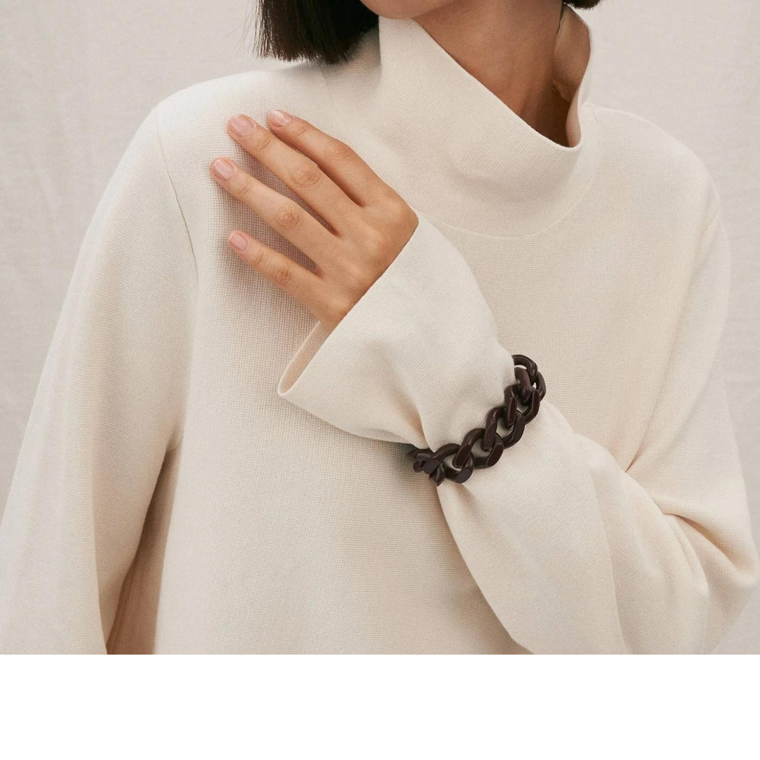 Every single piece of jewellery is cast, cut and assembled by hand by their producer in Italy who also make trims/details for bags and accessories from PRADA, DIOR, YSL, MARGIELA and others. The majority of their bracelets, necklaces, earrings and pendants are made of acetate, a popular material that has many positive properties. This costume jewellery is particularly light, durable and dimensionally stable, comfortable to wear on the skin and easy to care for.