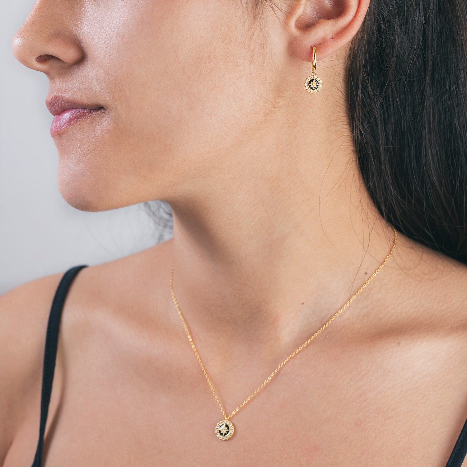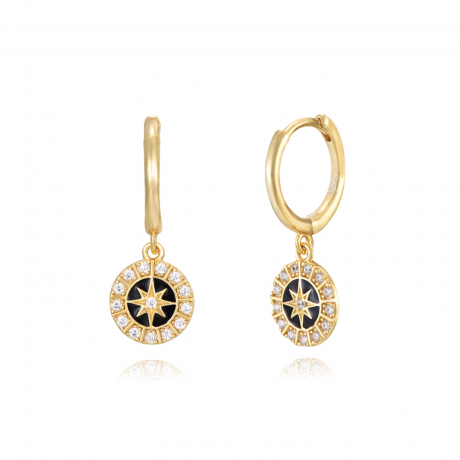 Huggie hoop earrings with a beautiful star detail, featuring cubic zirconia and black enamel.