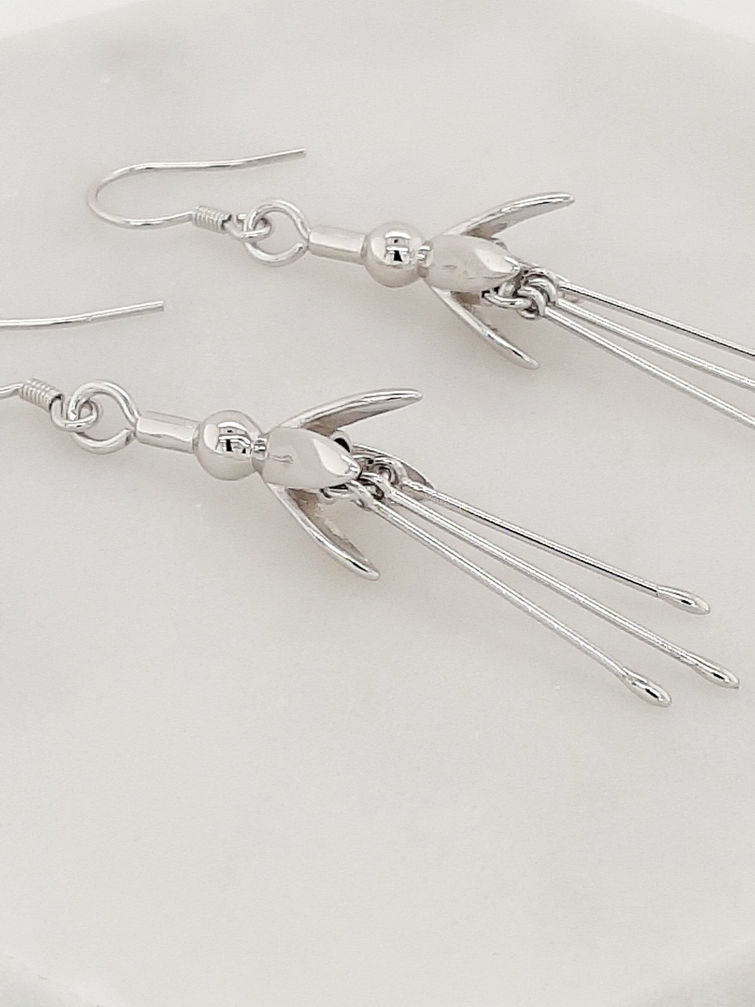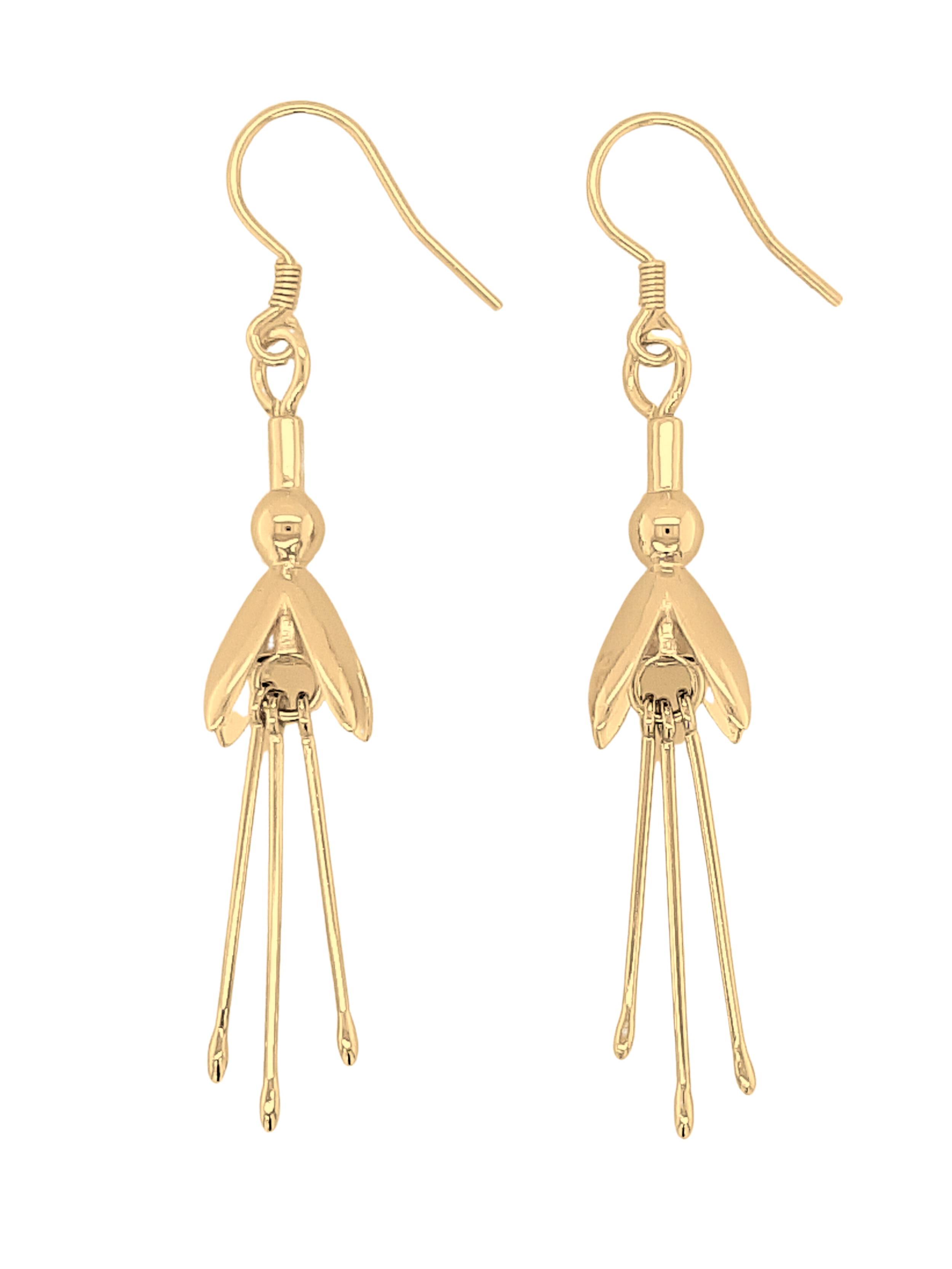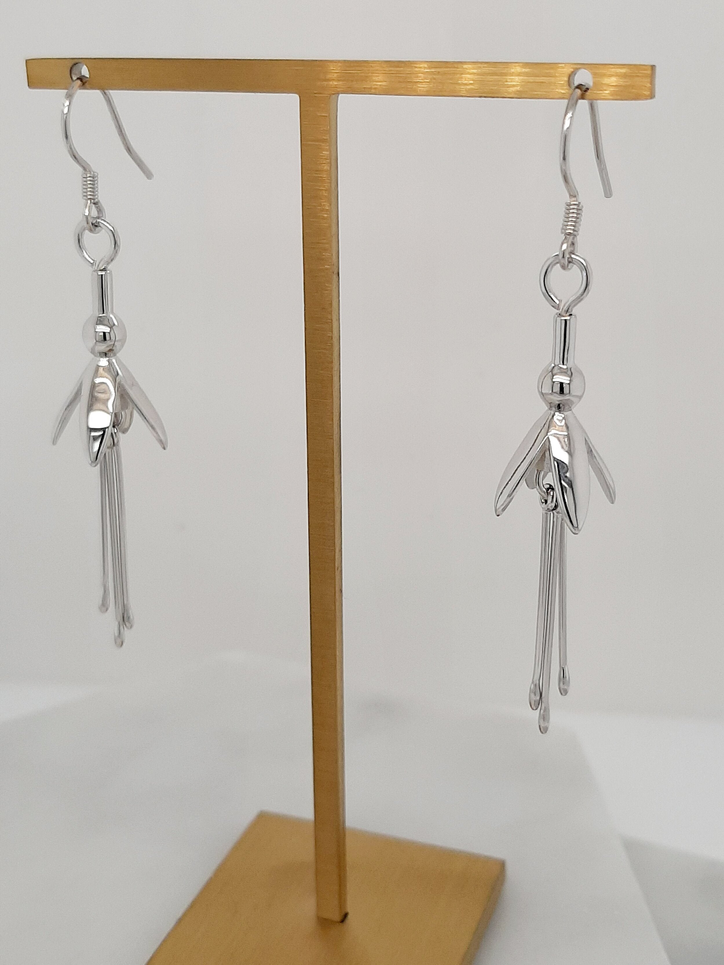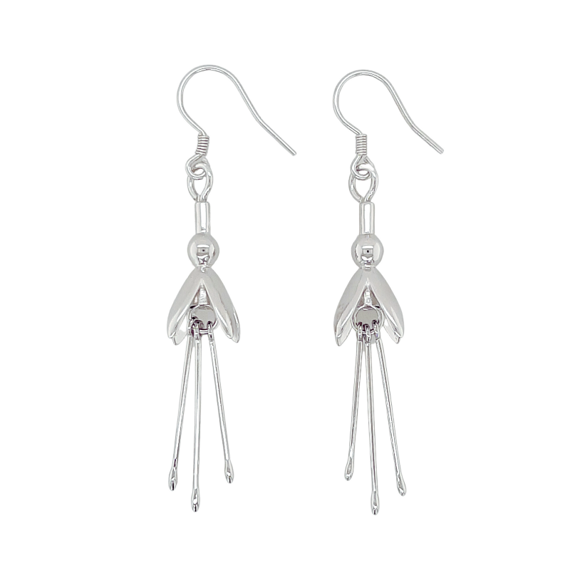 Elegant sterling silver drop earrings in the shape of a fuschia flower.