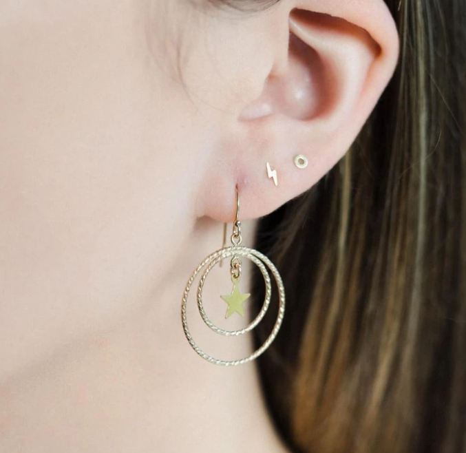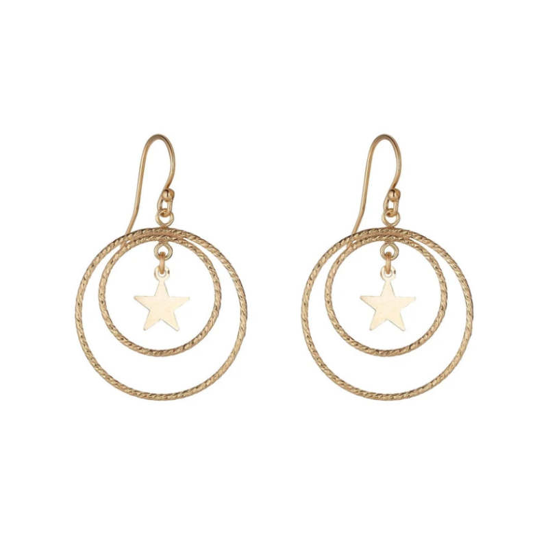 14ct gold filled textured double chandelier earrings with a gold filled star charm in the centre. Designed and and hand finished in Dublin by MoMuse.