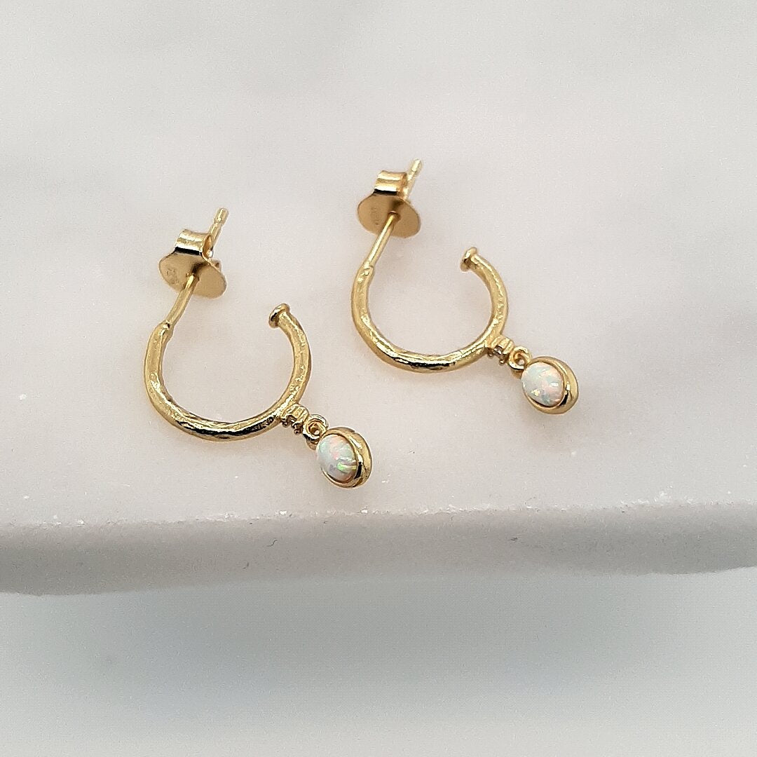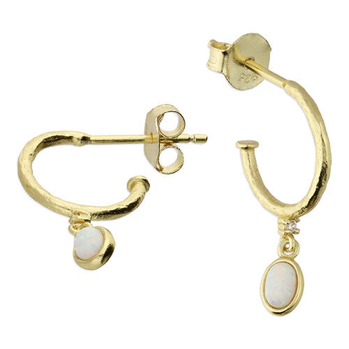 Sterling silver and yellow gold plated hoop earrings with a delicate cubic zirconia and drop synthetic opal.