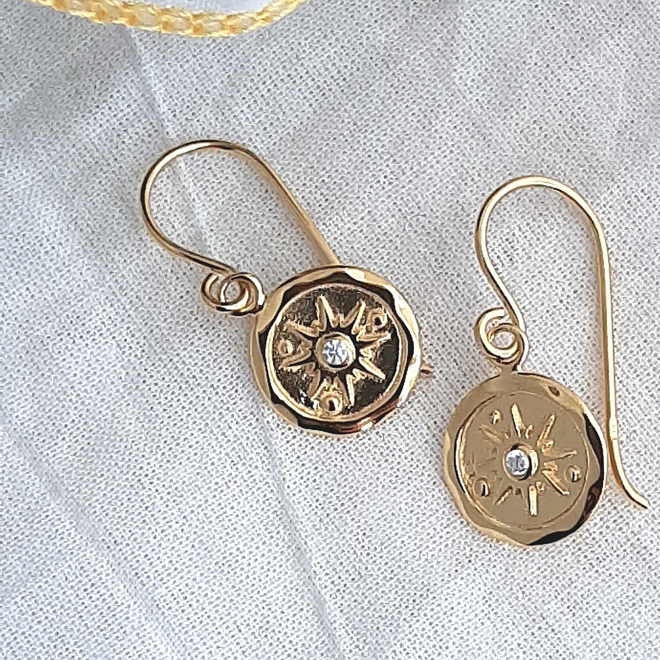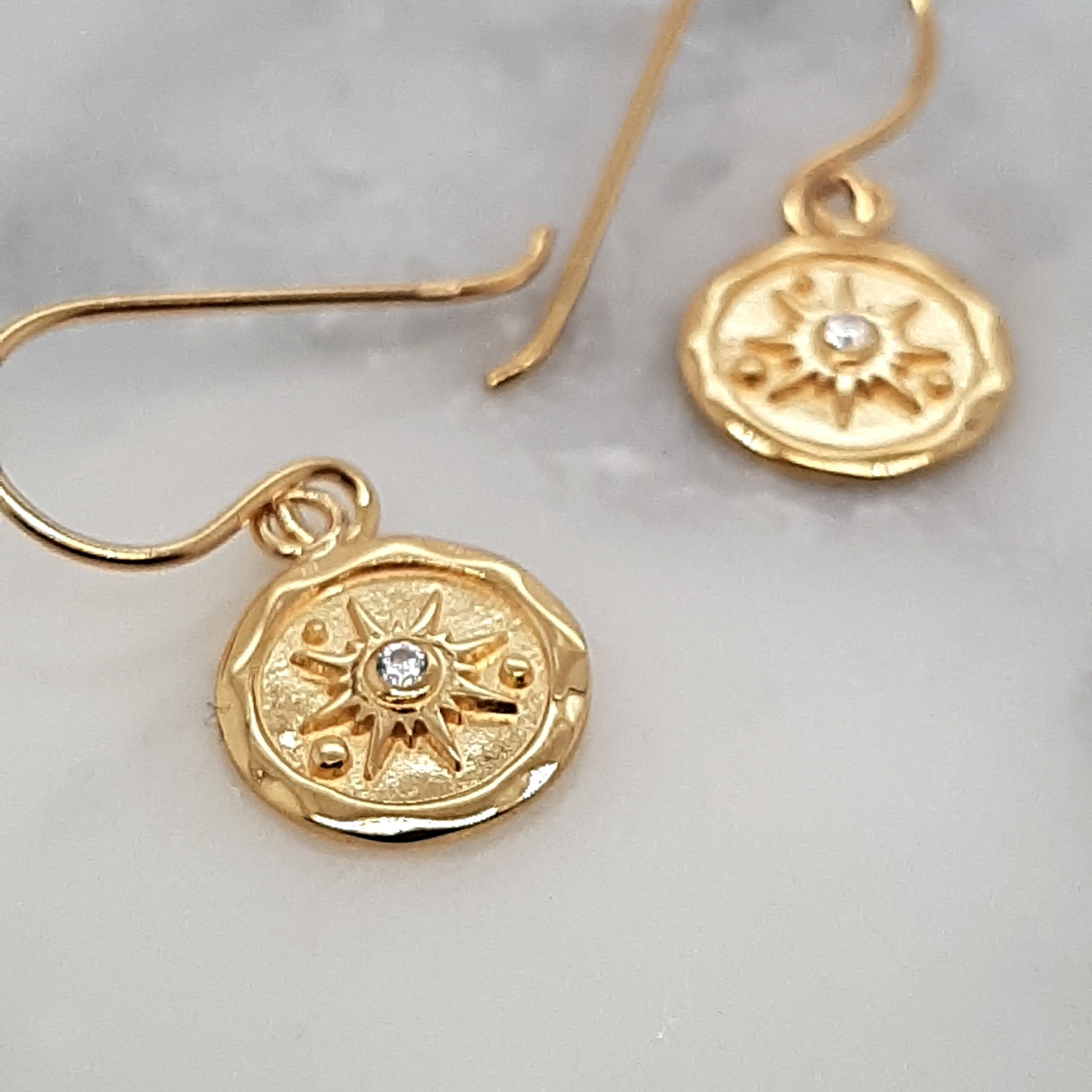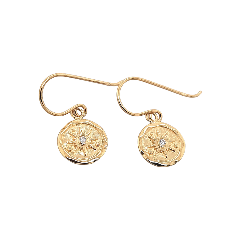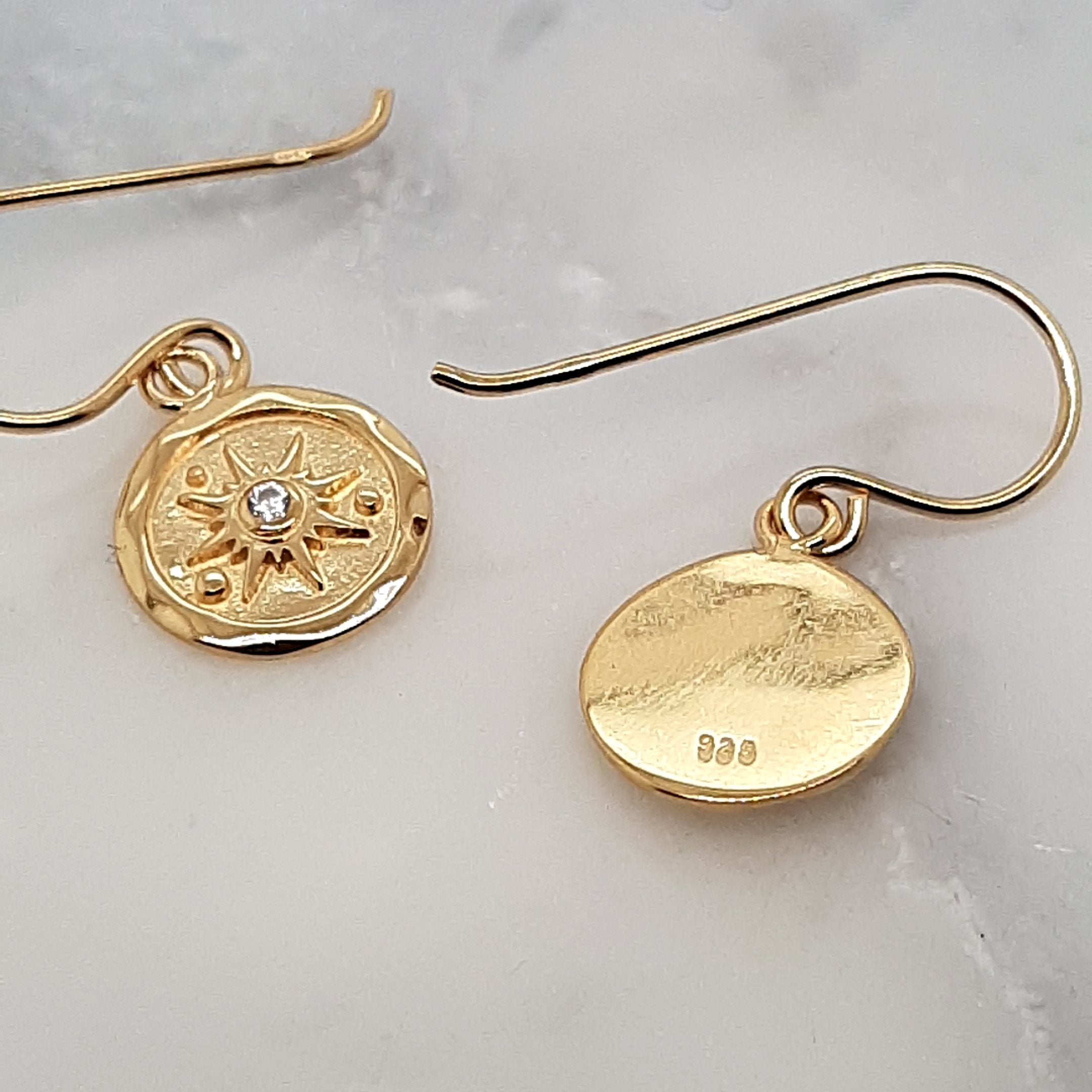 Round gold plated disc earrings. Sun design with a white cubic zirconia centre stone.