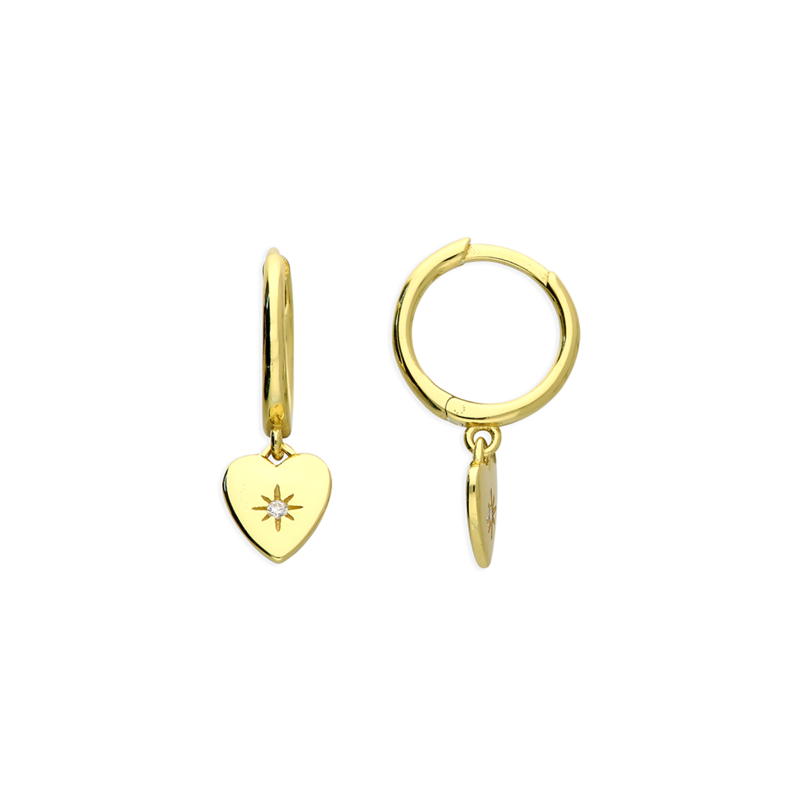 Sterling silver hoops with heart-shaped drops, each engraved with a starburst design and set with a tiny cubic zirconia.
