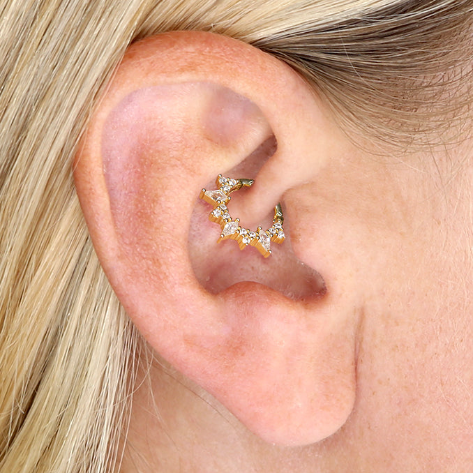 Single yellow gold plated on sterling silver, Sun Ray cubic zirconia daith hoop