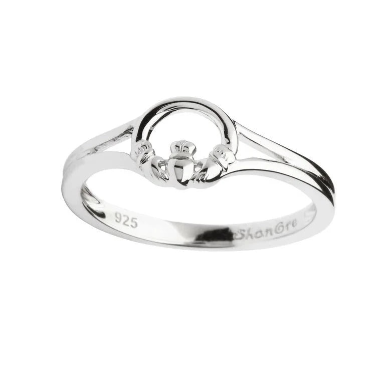 Created in sterling silver this split shank slim band features the traditional Irish Claddagh motif in the middle that’s made up of two hands holding a crowned heart. As the Claddagh signifies values of love friendship and loyalty this ring reflects your inner strength and ability to stay true to your loved ones.