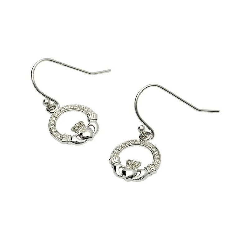 Sterling silver Claddagh drop earrings, with a row of glistening cubic zirconia. Symbolising love, loyalty and friendship, these stunning earrings make the perfect gift