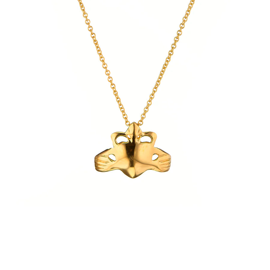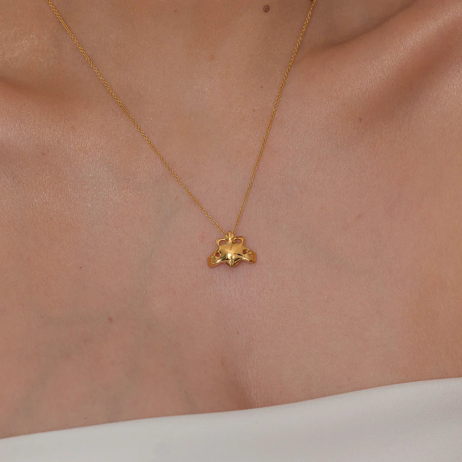 The floating Claddagh pendant is a beautiful and elegant piece of jewellery that features a reimagined Claddagh design suspended on a delicate chain. Love is love, and the Claddagh ring design with it's centuries of history, symbolize three things: Friendship, Loyalty and love. The crown design on this pendant features a fish fin like form that pays tribute to the fishing village on the edge of Galway city that once was called Claddagh. Overall, the Sterling silver floating Claddagh pendant is a stunning piece of jewellery that is perfect for anyone who loves Irish culture or simply appreciates beautiful and meaningful designs.