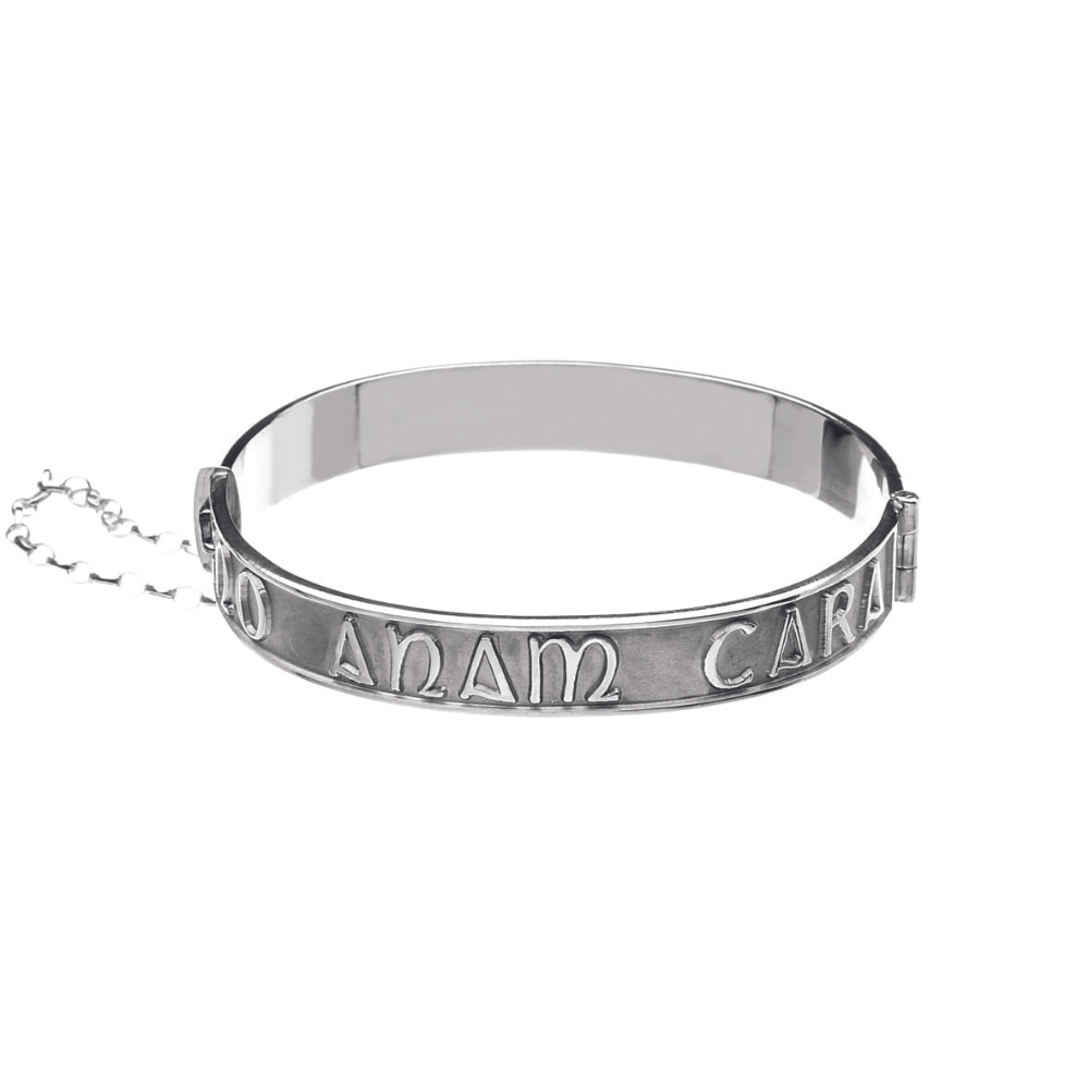 This is a traditional Sterling Silver hinged bangle with safety chain. The words ‘Mo Anam Cara’ are in Celtic script and cover both the front and back of the bangle.