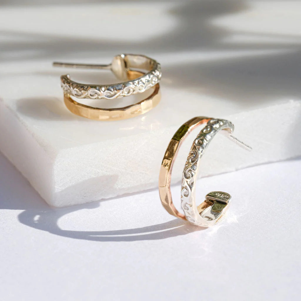 For those days when you cannot decide between silver and gold, wear our Aura Magic Hoop Earrings. These double band earrings, beautifully handcrafted in mixed metals, feature a lustrous bronze hoop with hammered detailing and a sterling silver hoop engraved with an Indian floral motif. Silver posts and butterfly fasteners add the finishing touch.