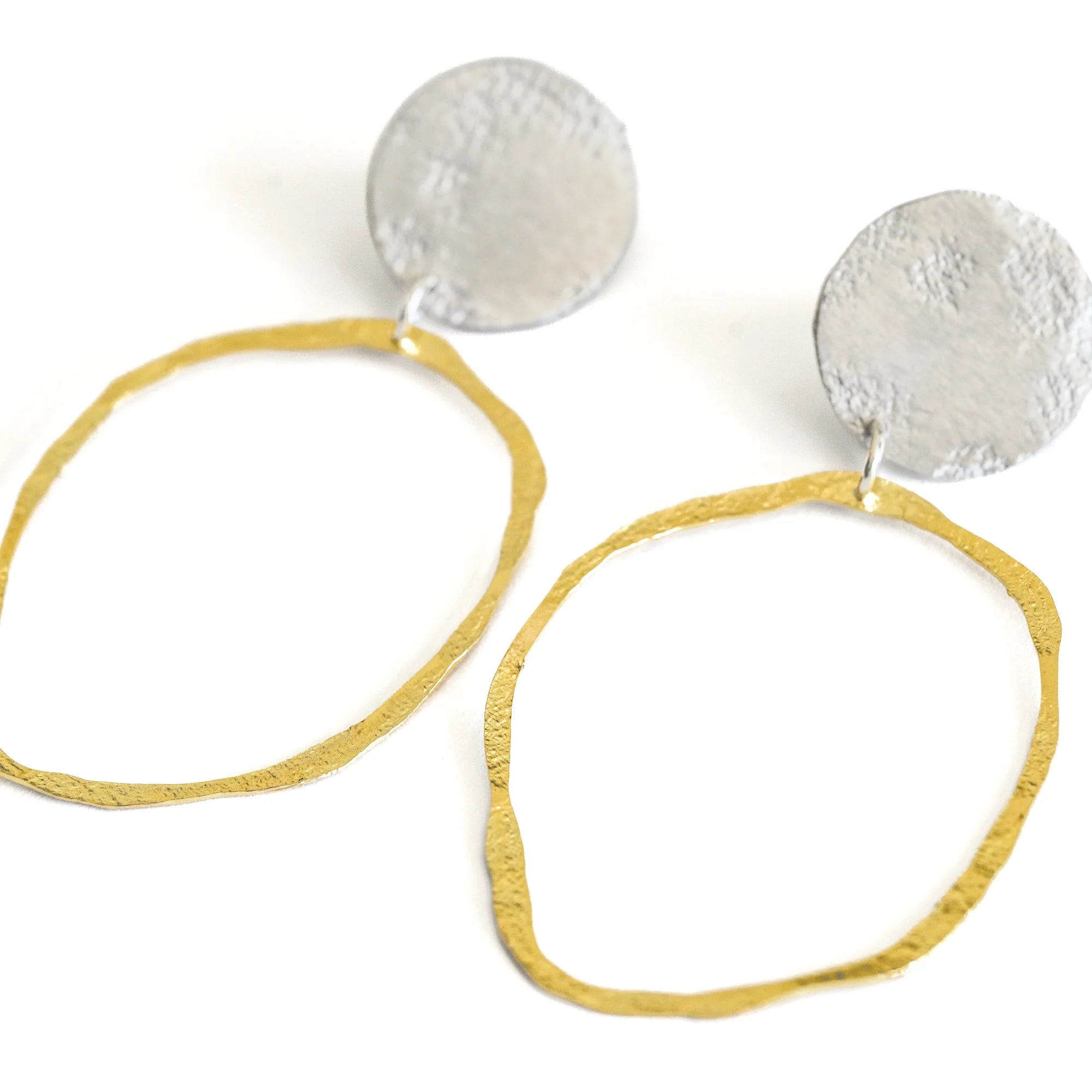 These feminine earrings combine the warmth of hand-formed brass with the soft texture of aluminium, creating a subtle yet striking contrast. Thoughtfully designed to be lightweight and comfortable, they make a gentle statement, perfect for adding a refined touch to everyday or special occasions.
