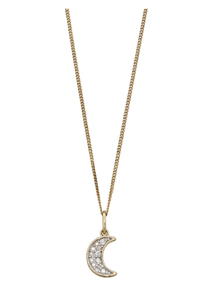 Delicate 9ct gold moon pendent with 5 pave diamonds, on an adjustable 9ct gold chain.