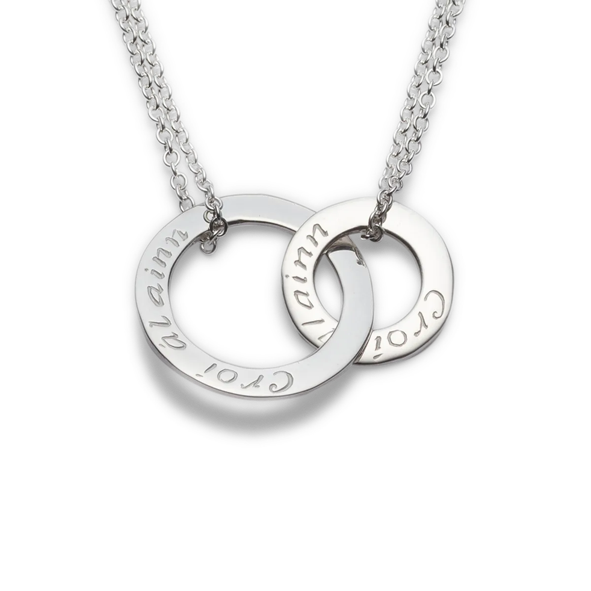 Hold on to love. This Croí álainn pendant is a beloved piece to cherish always. Two interlocking circles, two beautiful hearts entwined. A symbol of endless love and connection. One larger circle linked with one smaller circle, both inscribed with the Irish words Croí álainn. Beautiful heart.