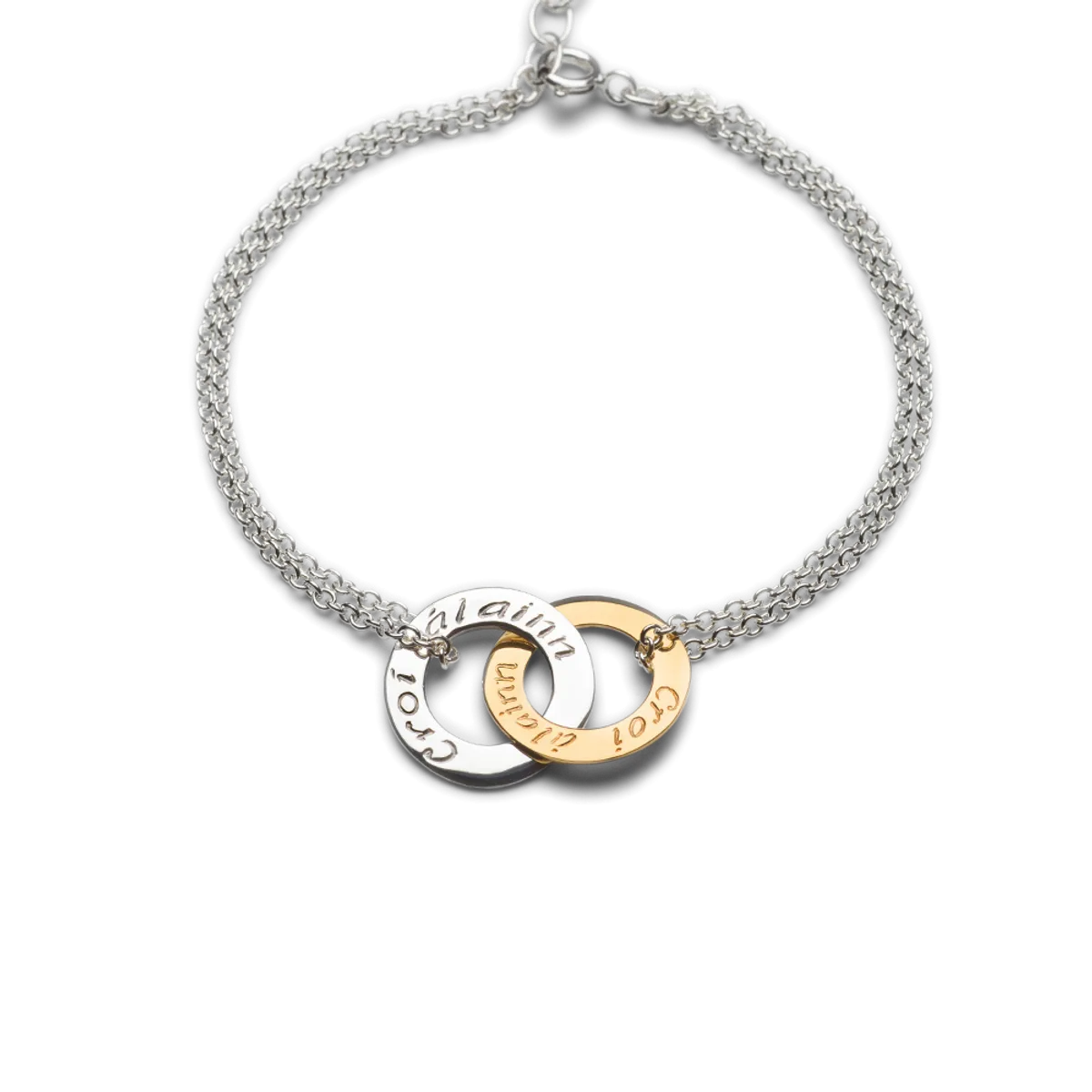 Two infinite circles connected. One of silver and one of gold. Both inscribed with the Irish words Croí álainn. Beautiful heart. Reminding us that we are all connected and to hold on to your beautiful heart. This wonderful sentiment is engraved on both sides of the circles, so no need to worry which way round you wear it!