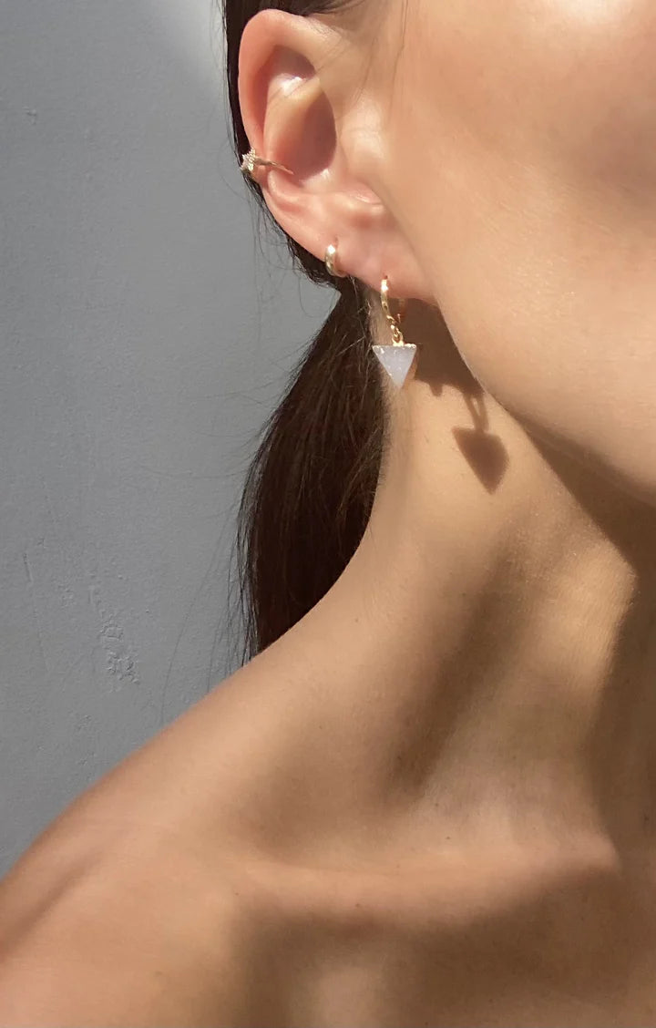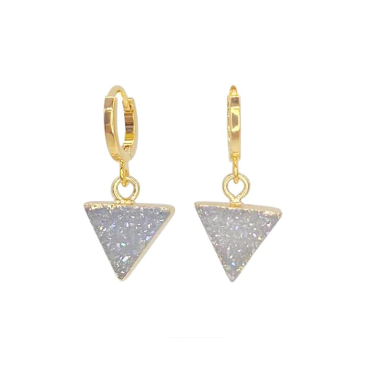 Dune earrings are handmade with natural titanium treated Aurora white Druzy stones and 14ct gold plated brass hoops.
