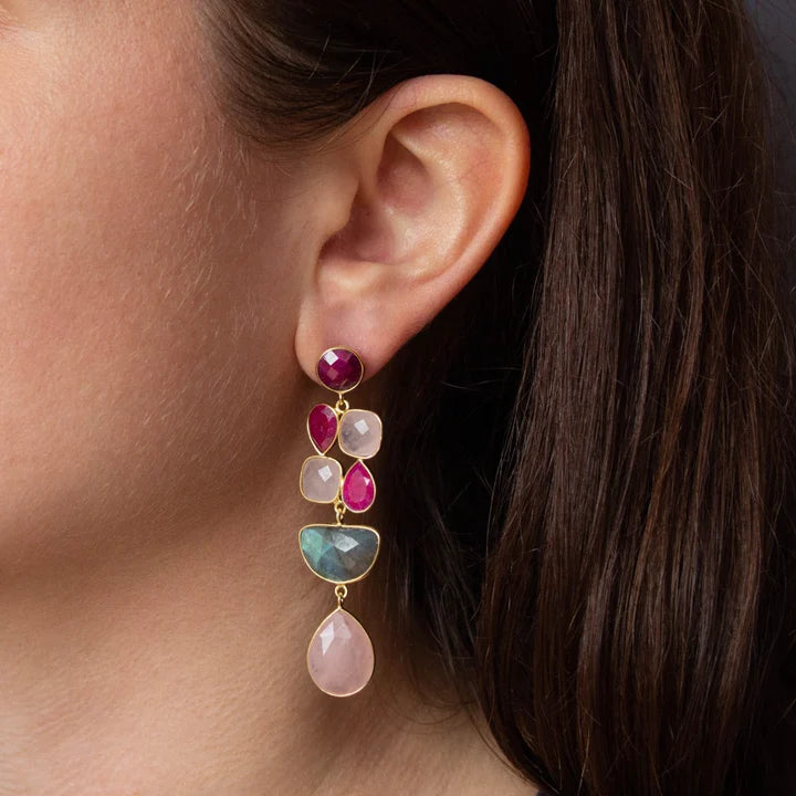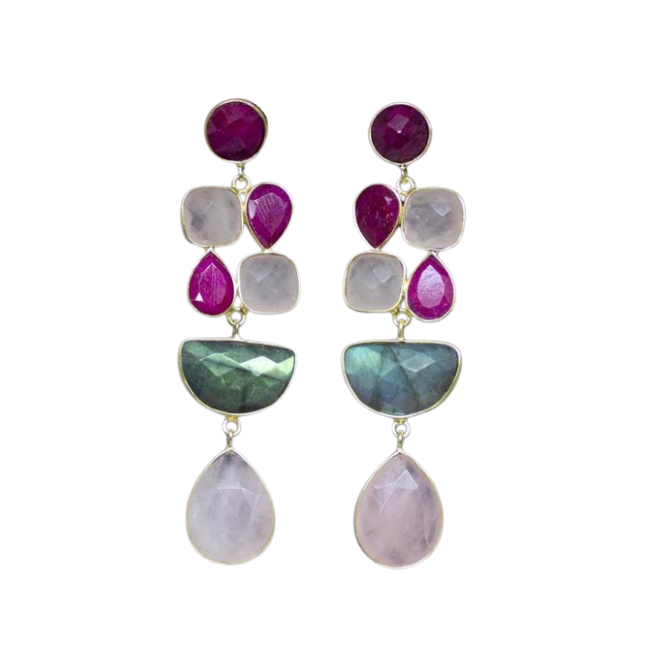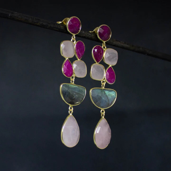 Multi stone statement earrings, handmade in 18ct gold vermeil and embellished with rough rubies, rose quartz and labradorite gemstones.