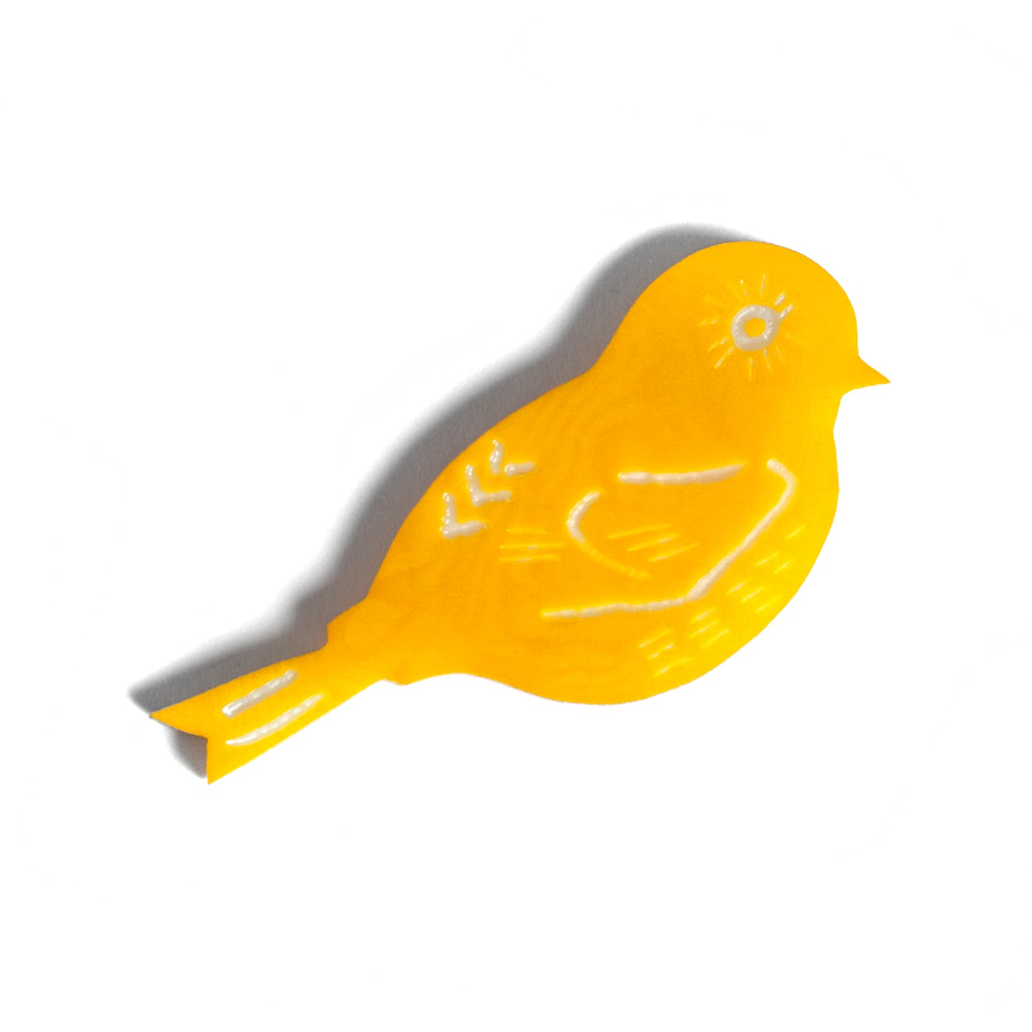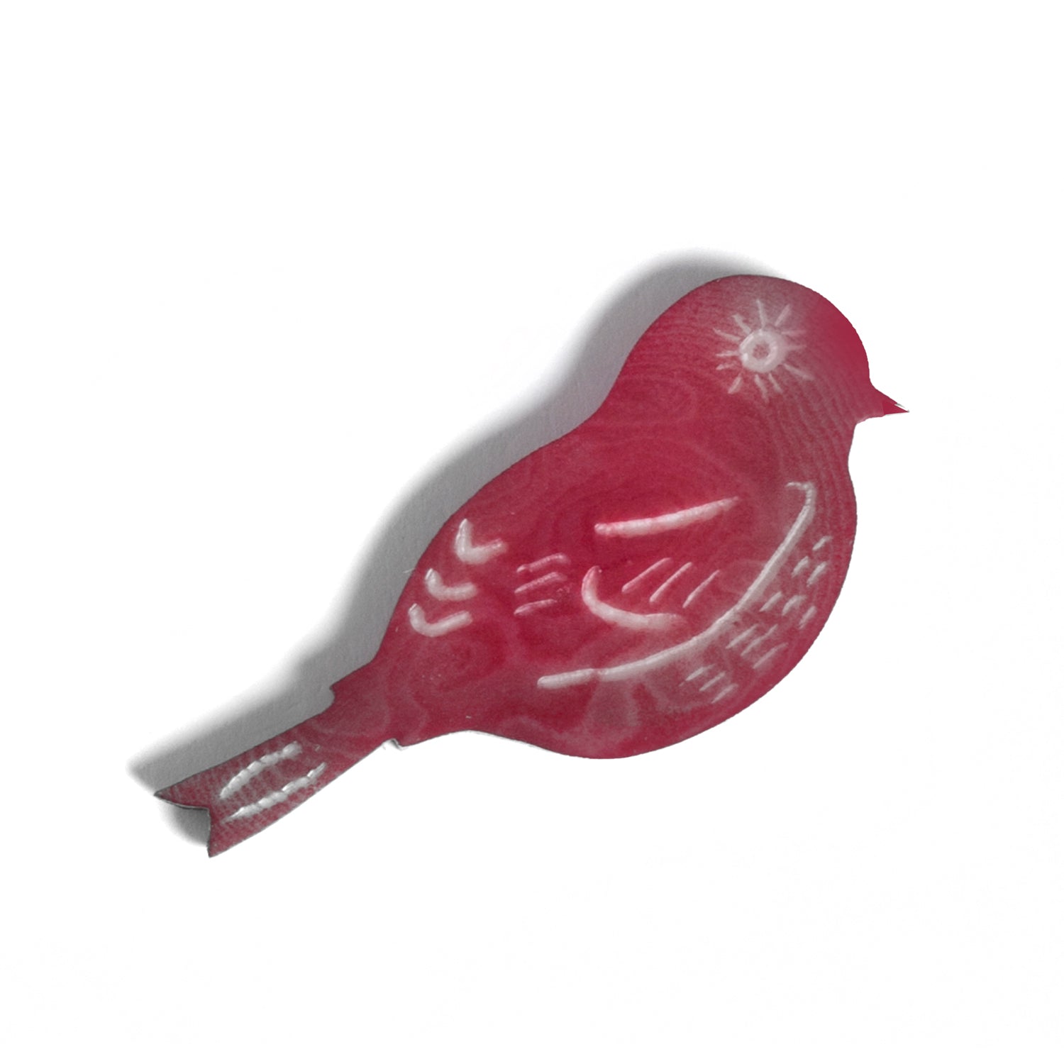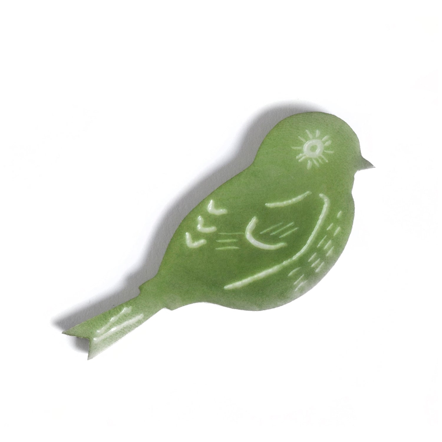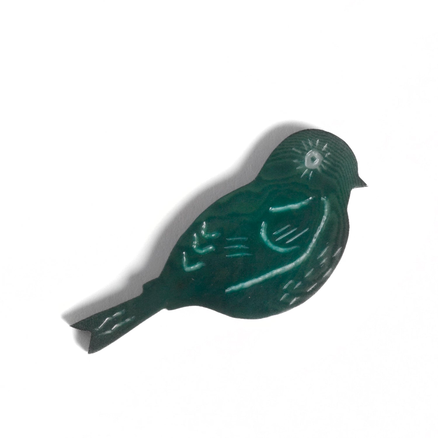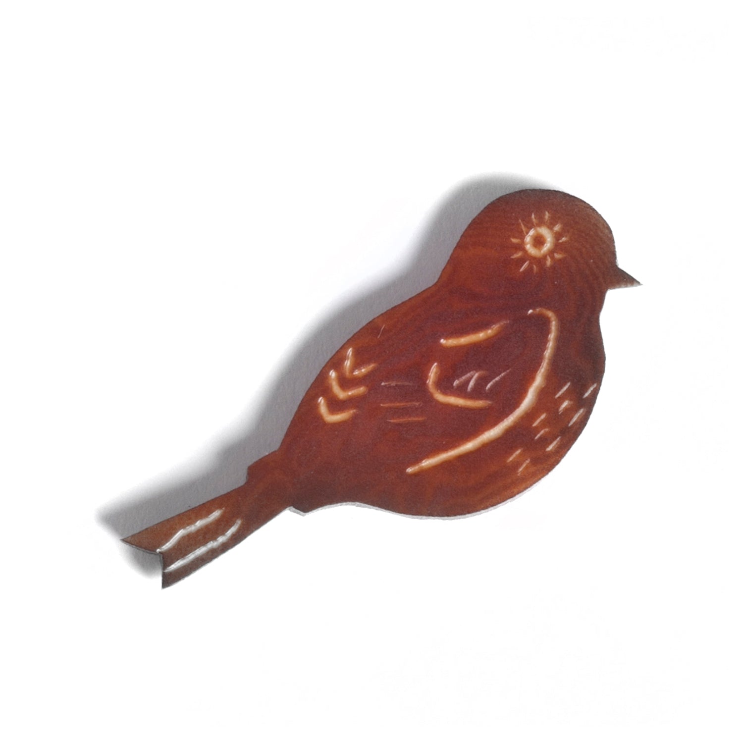 Warbler bird brooch hand carved from a tagua nut, a seed from a type of palm that grows in the South American rainforests. Often known as vegetable ivory, tagua is an environmentally friendly and sustainable alternative to animal ivory.  A nut is selected that is as close to the desired finished shape as possible, which is then formed using a variety of sanding processes and polished to achieve a smooth surface.