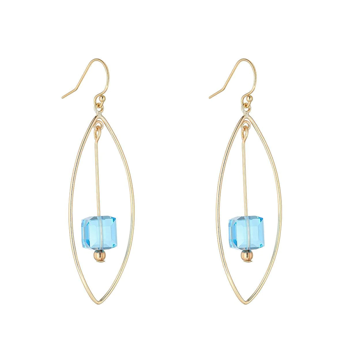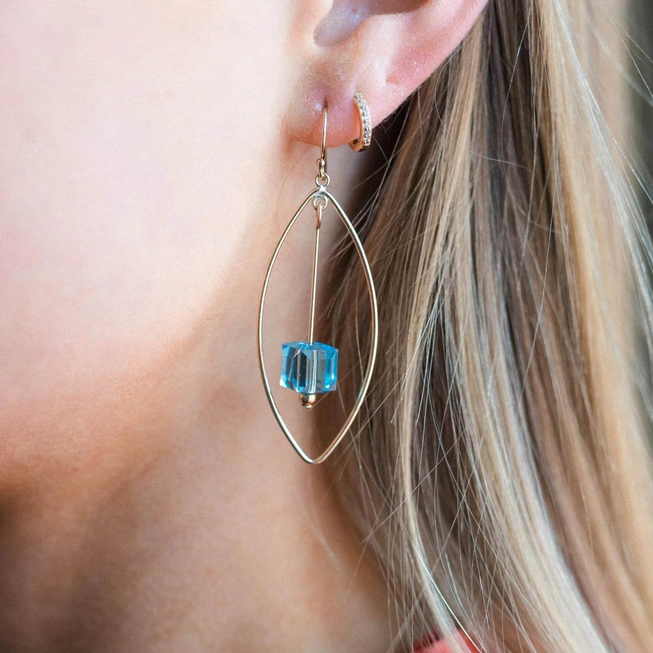 14ct gold filled oval chandelier earrings with 8mm Aquamarine crystal cube. Pair these with our other crystal pieces from MoMuse.