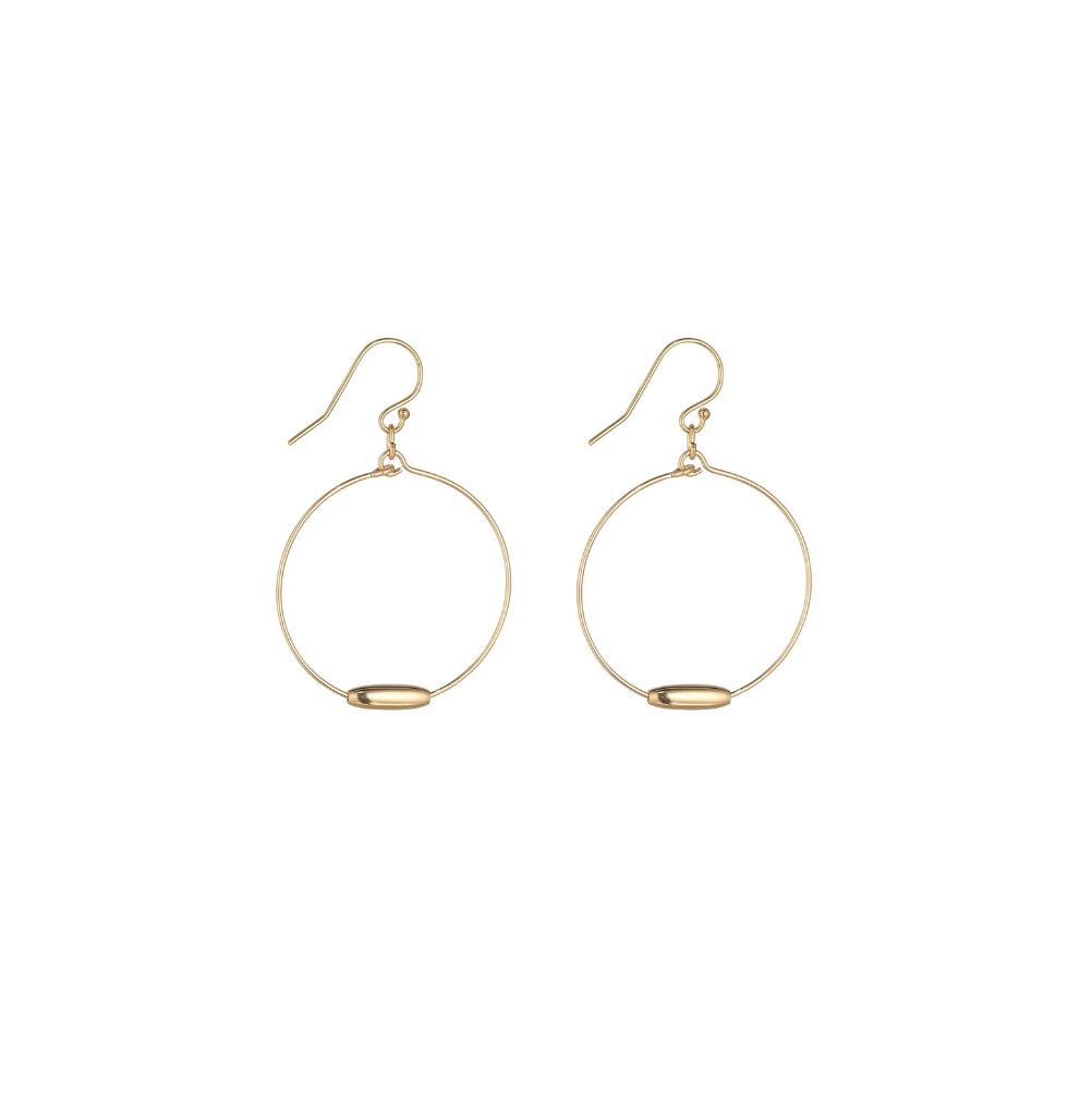 A versatile pair of hoop earrings adorned with a sleek and slender golden bean.
