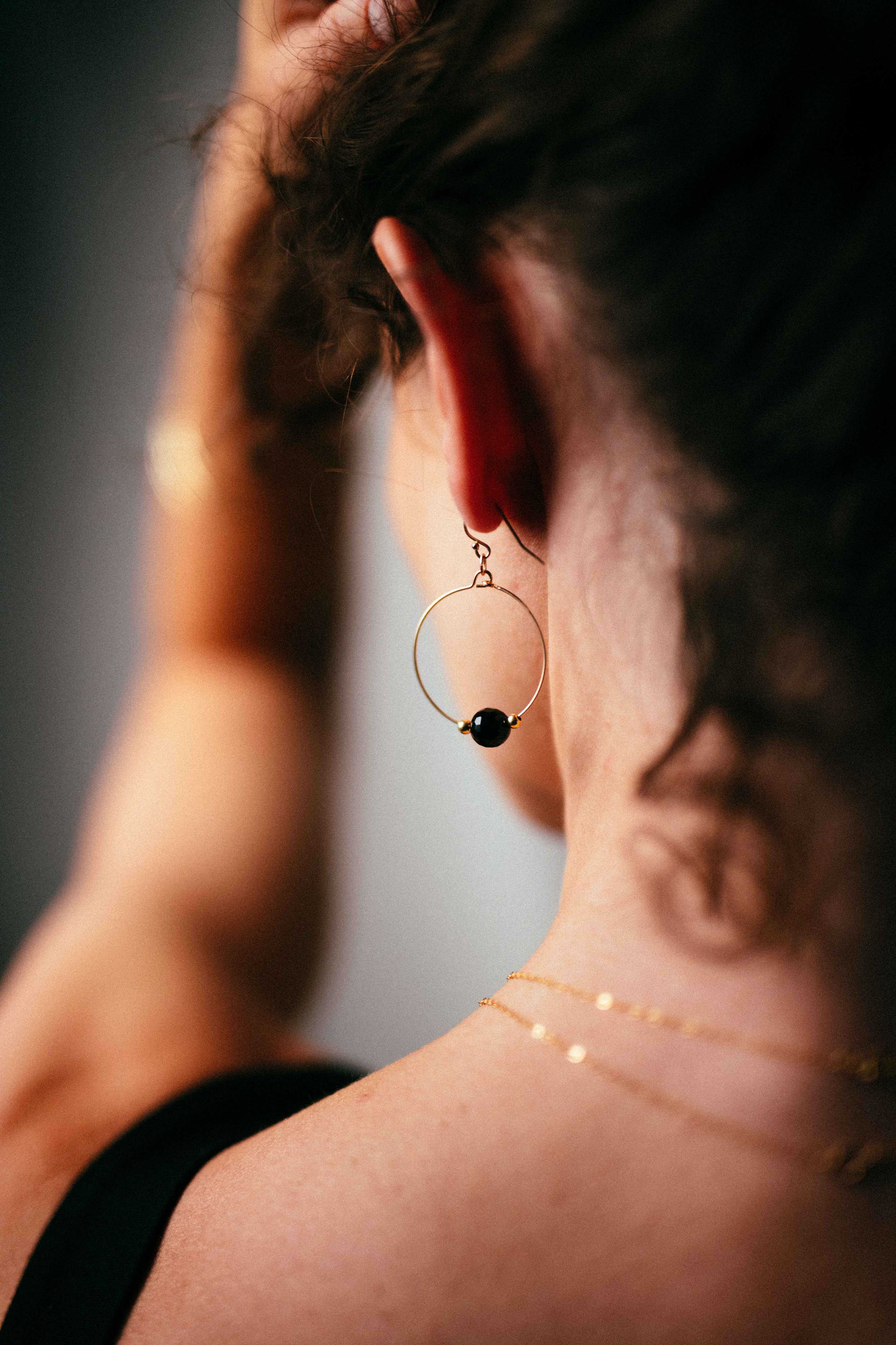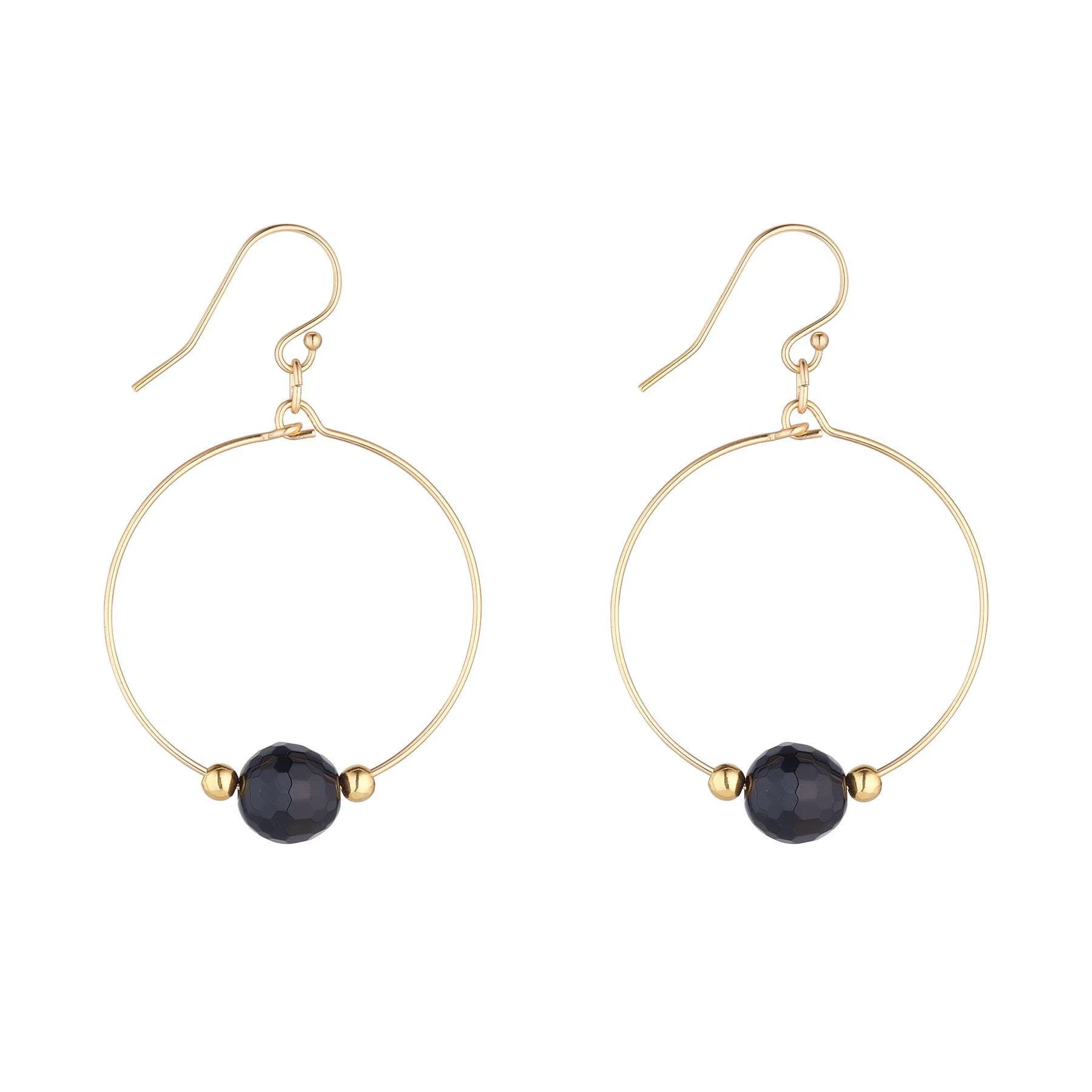 Black and gold, a beloved colour combination that never goes out of style. These versatile 14ct gold-filled hoop earrings feature a sparkling black agate ball. Mix and match with other black agate pieces from MoMuse.