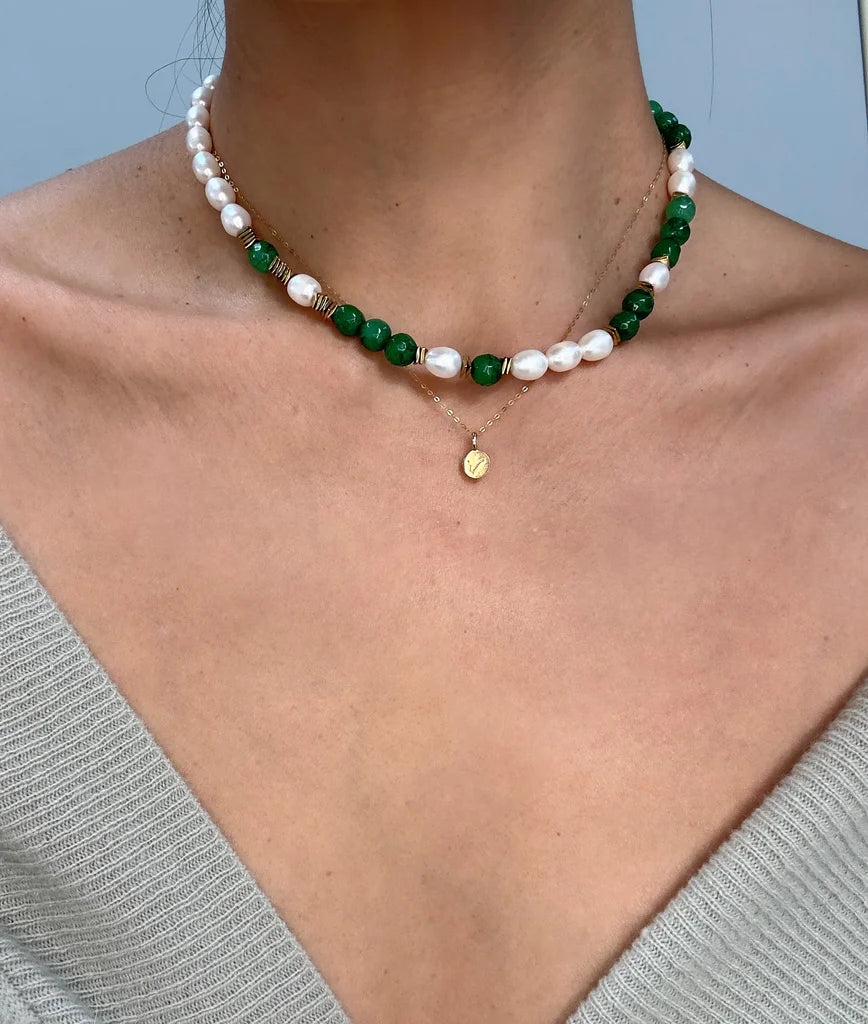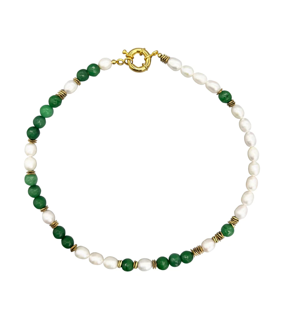 Handcrafted with beautiful green agate stones mixed with pyrite electroplated in gold and natural pearls, designed to be worn as a choker style necklace or double layered bracelet. Please check your size when ordering as this style is not adjustable.