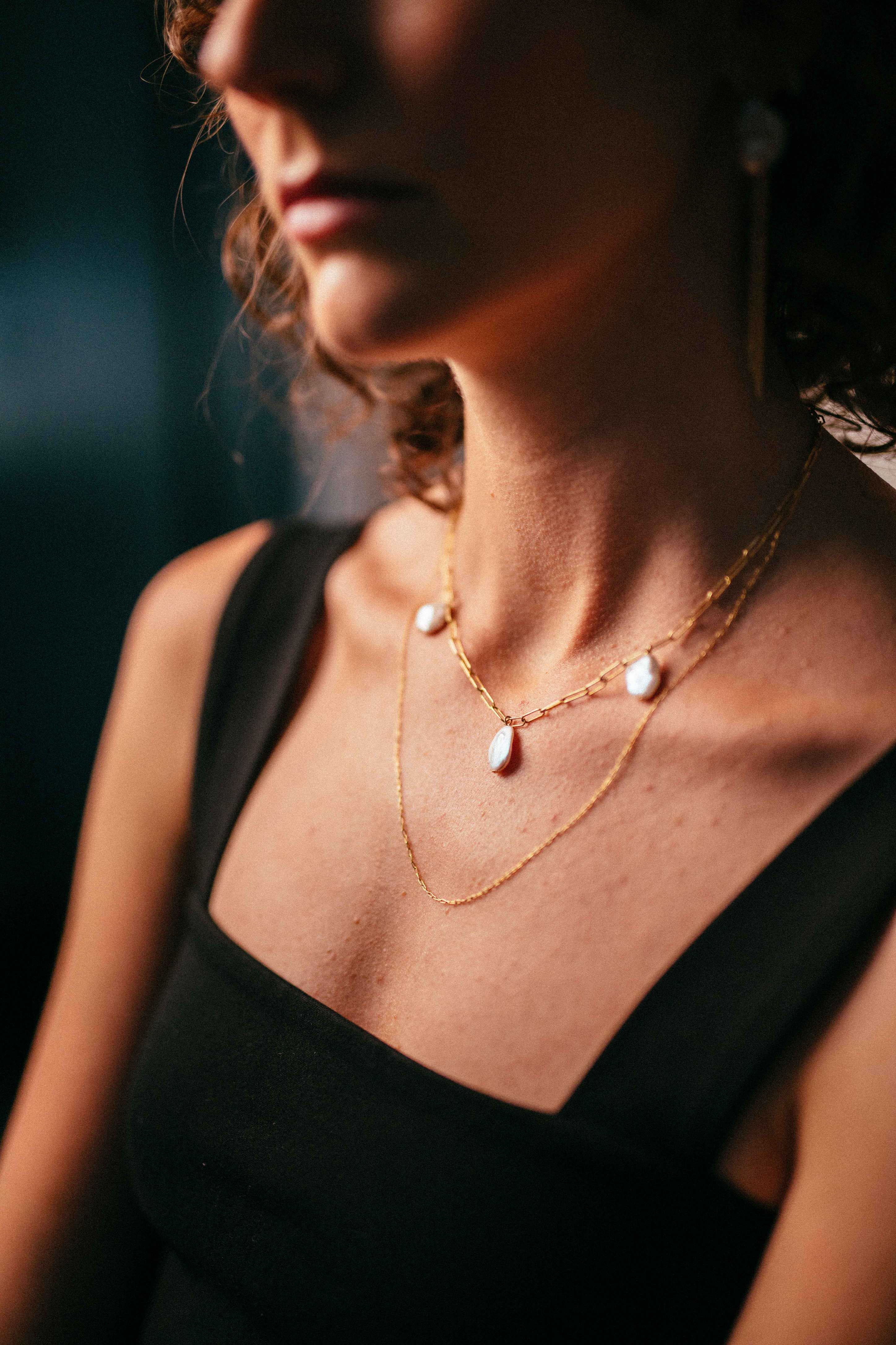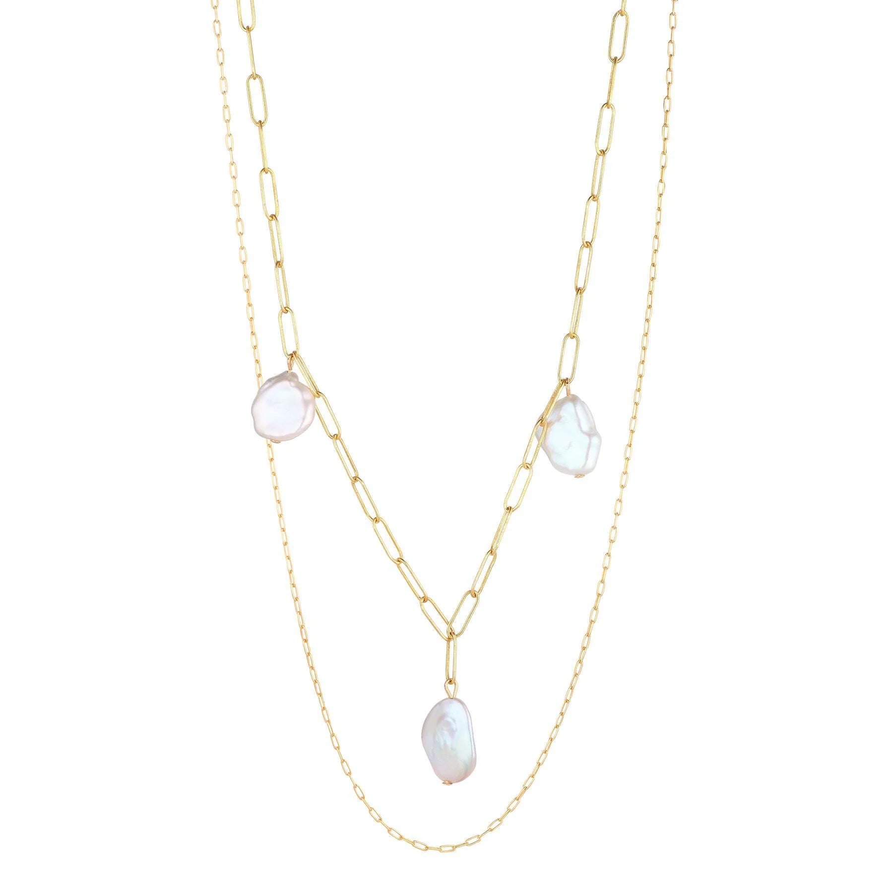One piece of jewellery, twice the fun. This double layered necklace features two different styles of chains: paperclip and fine, as well as a flat baroque pearl as the centre-piece. Mix and match with our other baroque pearl pieces from MoMuse.