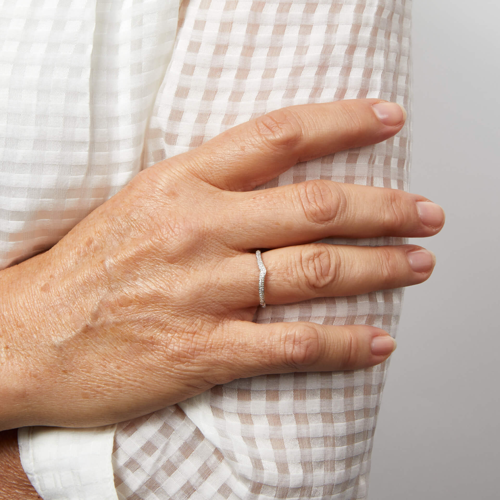 Stunning 9ct white gold featuring a striking V shape adorned with dazzling micro diamonds. Ideal as a wedding ring, the V shape of this ring beautifully complements a solitaire-style engagement ring, allowing the stone to nestle perfectly within the V. Can also be worn stacked with any white gold ring as an everyday essential.