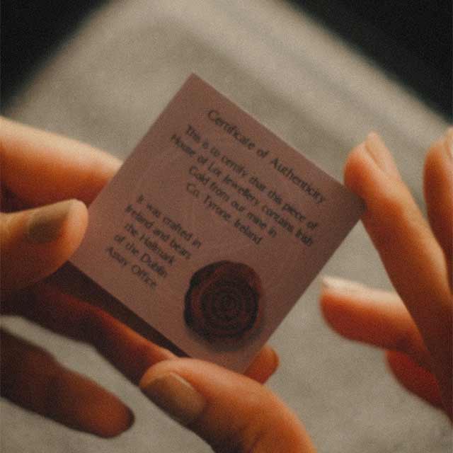 Each piece is also accompanied by a certificate of authenticity, to certify that each piece of HOUSE OF LOR Jewellery has been made with rare Irish gold from the mine in County Tyrone. 100% Irish Gold Mined,