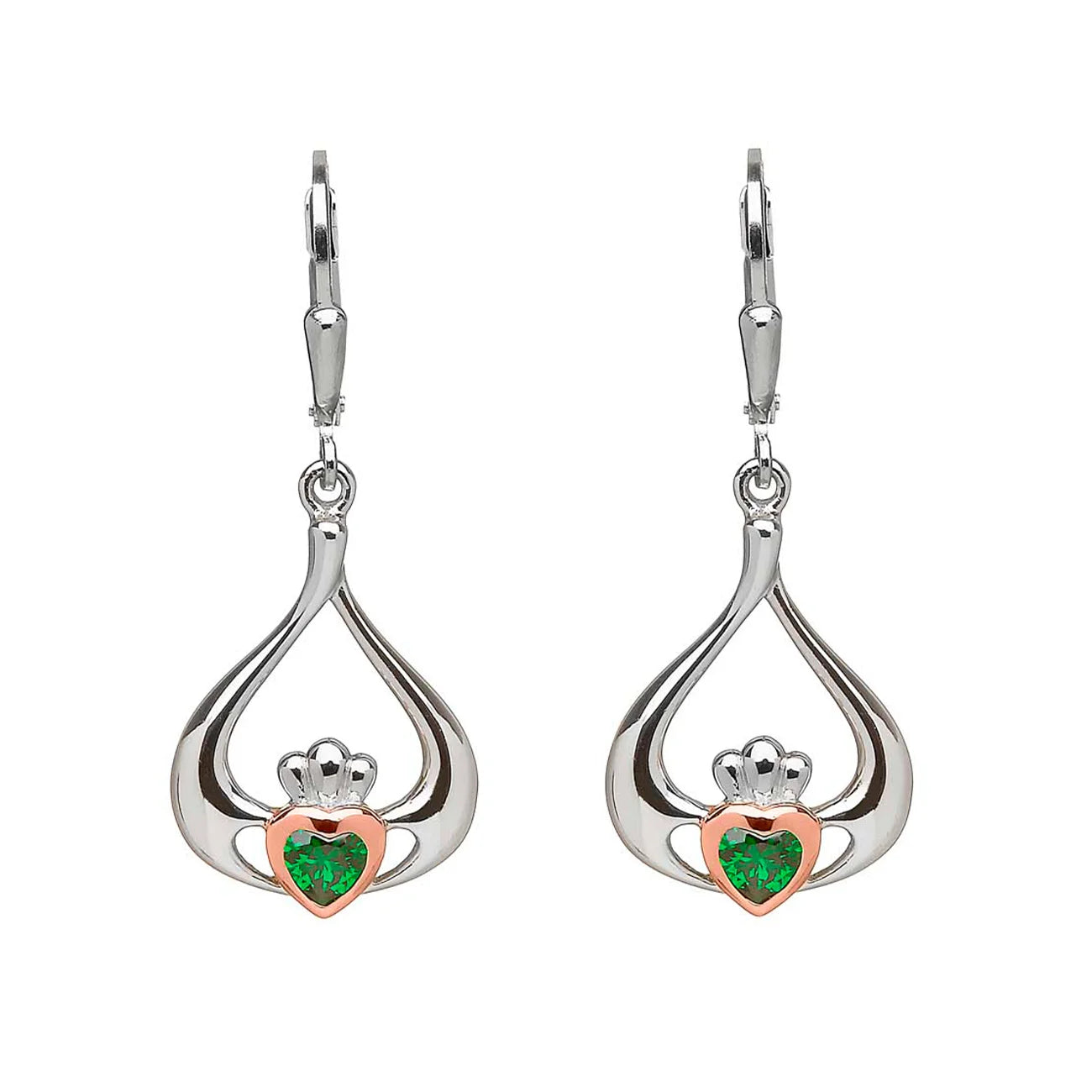 Claddagh Green Stone Teardrop Earrings from House of Lor. Crafted with love in Ireland from sterling silver and Irish rose gold, set with a vibrant green cubic zirconia stone heart.