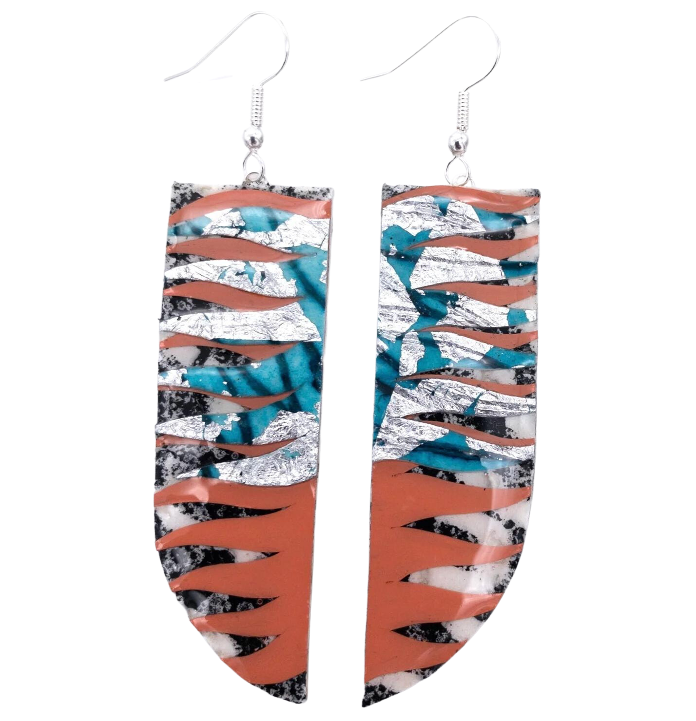 Super-lightweight textured statement earrings in pink with silver/black and copper/blue hand cut triffid detail. Finished in a high gloss sheen.