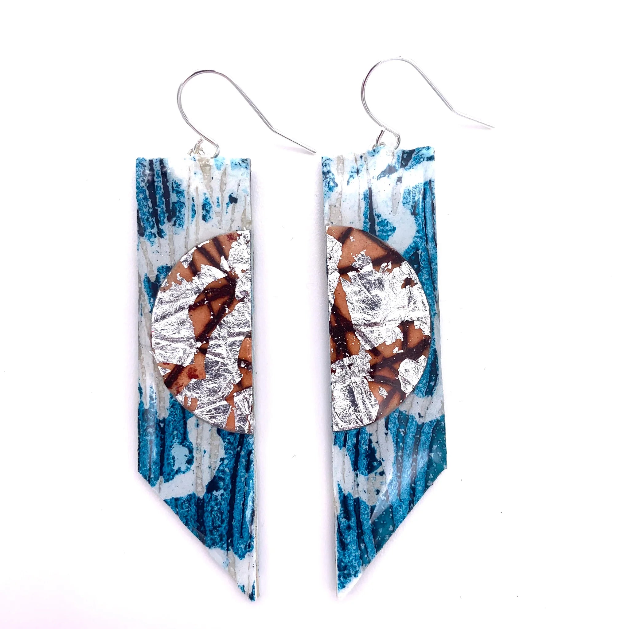 Super-lightweight textured earrings in teal, silver/umber sgraffito half-disc detail. Finished in a high gloss sheen.