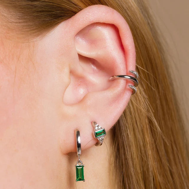 These emerald green baguette huggie hoop earrings offer a styling design and the best of the green stone jewellery trend. A versatile hoop earring design, these pair of green baguette hoops have been made to be worn every day and work beautifully in upper, mid and lower ear piercings. Choose between sterling silver or gold plated, each huggie hoop earring has been studded with green baguette cubic zirconia stones that adds pops of stunning green hues to your ears.