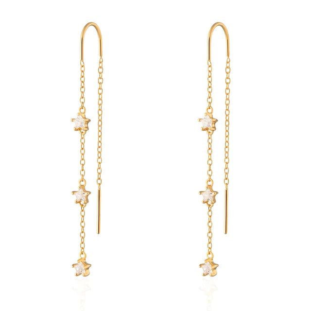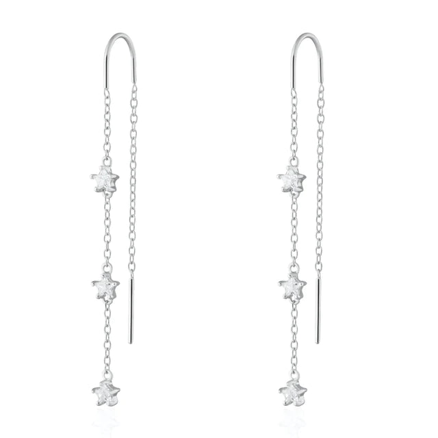 These sterling silver threader earrings features 3 in a row sparkling stars for extra glamour. Simply thread through your piercing for all day comfort that will add subtle movement and complete that sophisticated look. Also available in gold plated sterling silver.