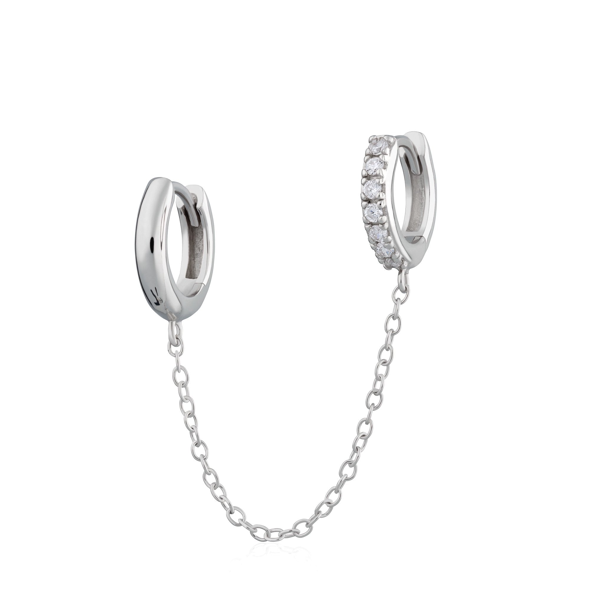 Joined by a connecting chain this single earring consists of one polished huggie and one sparkling huggie hoop paved with clear nano cubic zirconia to give an extra bit of sparkle. Ideal if you have two piercings in one ear, as you can wear this single double hoop earring in either the lobe or lobe to helix or cartilage.
