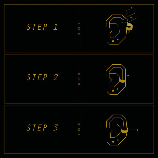 Find the narrowest part of your ear. In most people this is the curled over part of the ear where upper cartilage piercings are - or just above the lobe. Without flexing or trying to widen, slide the ear cuff into position - rotating the ear cuff slightly as you do this can help. NB. Be especially careful not to try and widen the opening of cuffs with inset stones, as this can damage your jewellery.